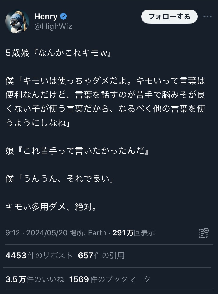 普通のパパ「キモいはダメだよ!それは脳みそが良くない子が使う言葉だからね!」←3万いいね 2024/5/22 速報 1: document.write(” + ”); 関連記事 document.write(” + ”); 続きを読む ——— Source: アルファルファモザイク 普通のパパ「キモいはダメだよ!それは脳みそが良くない子が使う言葉だからね!」←3万いいね