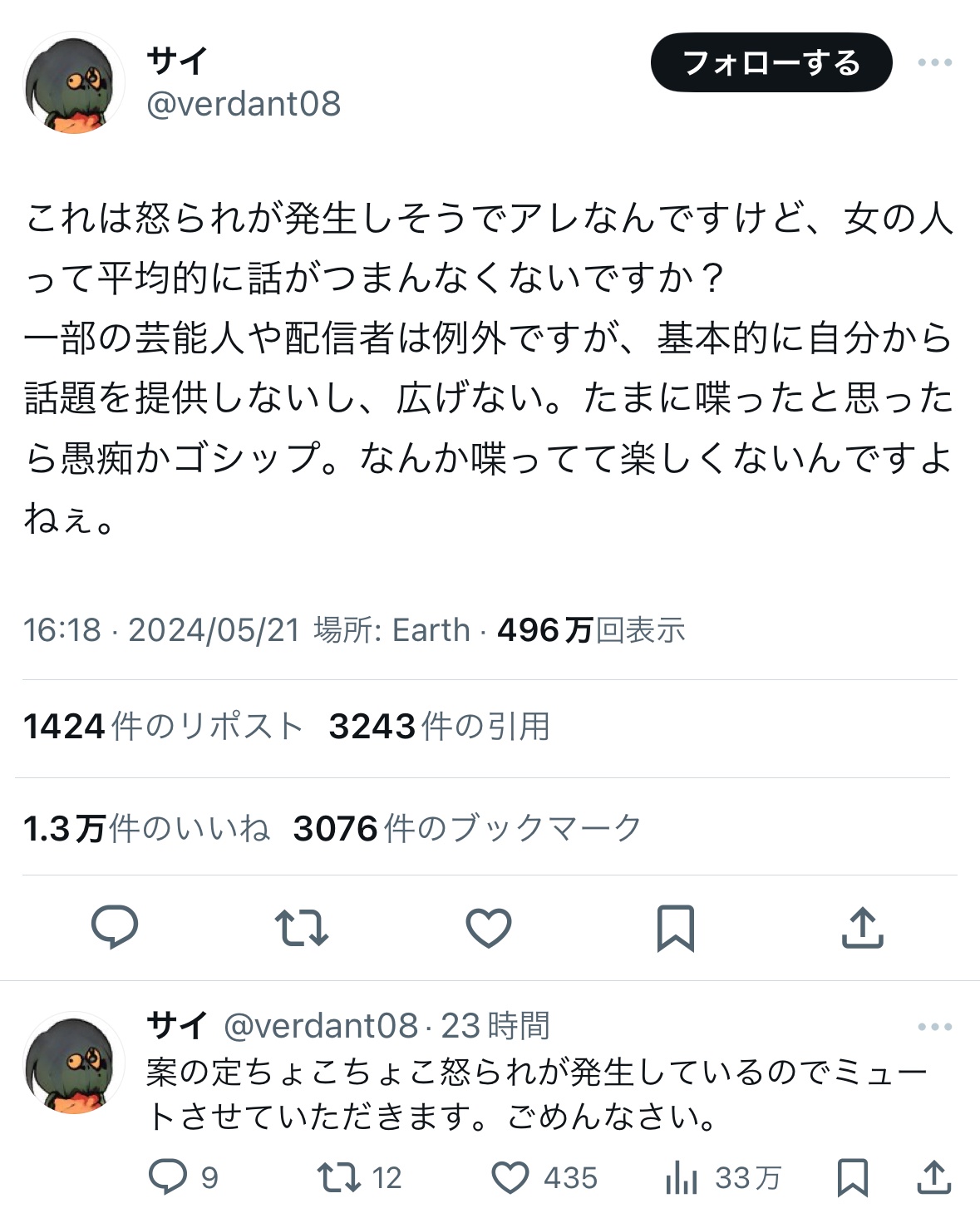 【画像】陰、女子の逆鱗に触れる。。。 2024/5/22 速報 1: 反応 document.write(” + ”); 関連記事 document.write(” + ”); 続きを読む ——— Source: アルファルファモザイク 【画像】陰、女子の逆鱗に触れる。。。