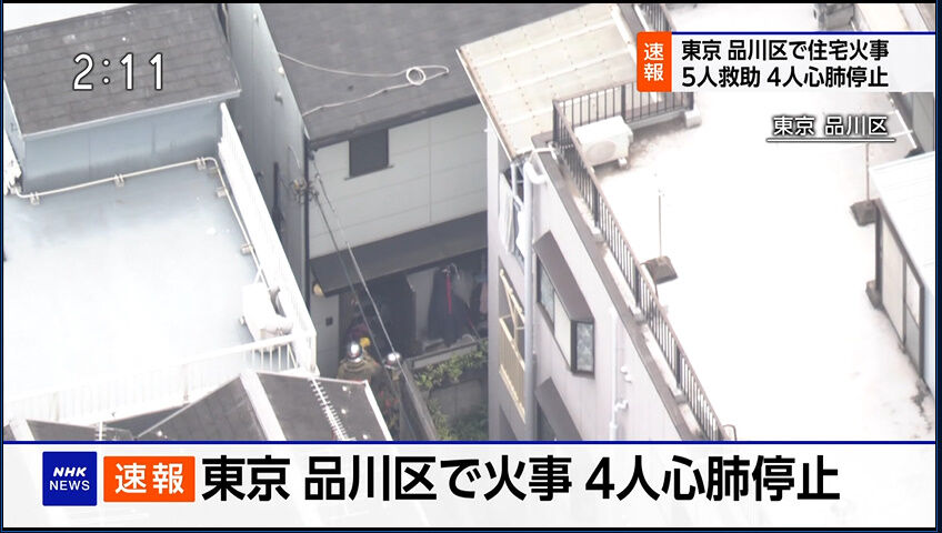 東京消防庁によりますと、23日午後1時半ごろ、東京・品川区戸越の2階建ての住宅で火事があり、これまでに5人が救助され、このうち4人が心肺停止の状態だということです。