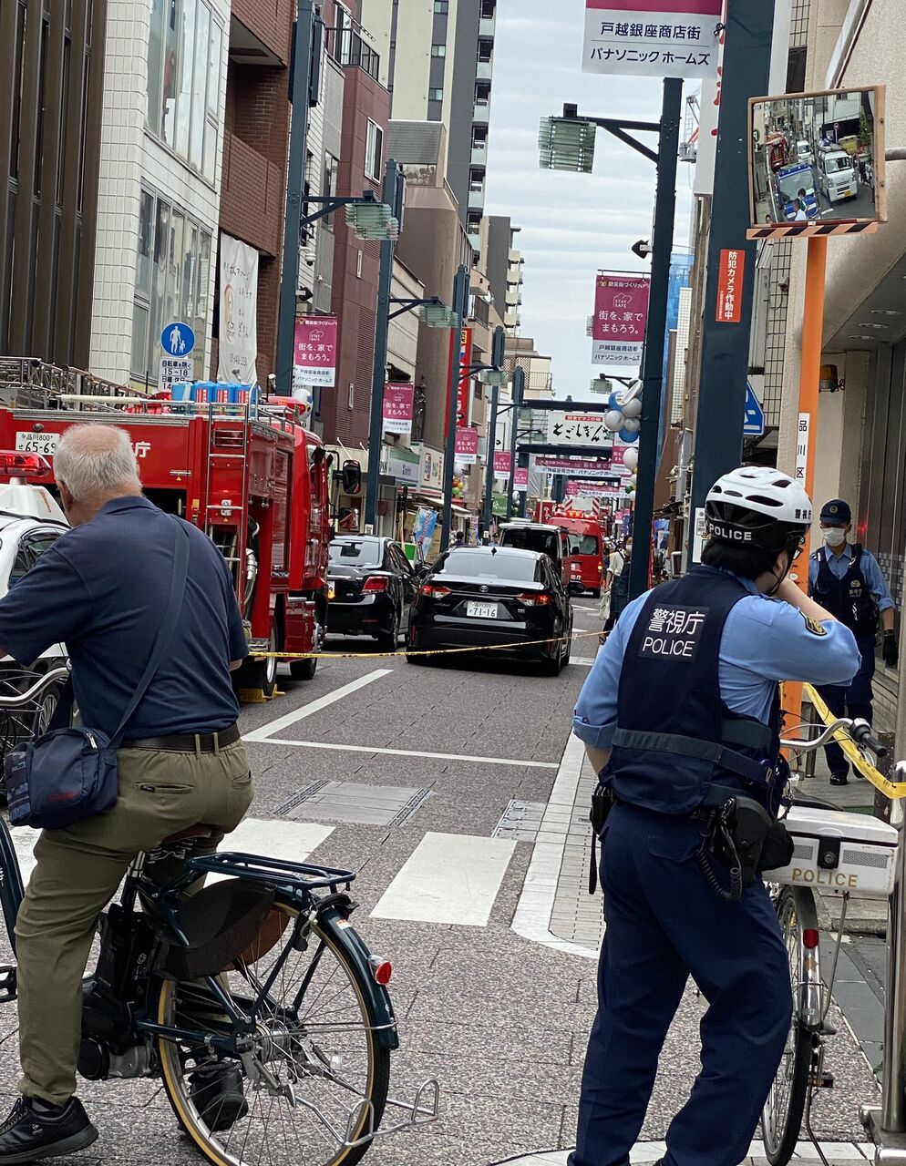 現在戸越銀座商店街、多くの消防車、救急車が来て通行止めとなっています。