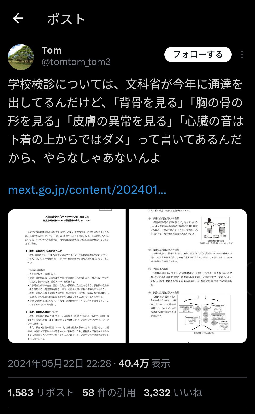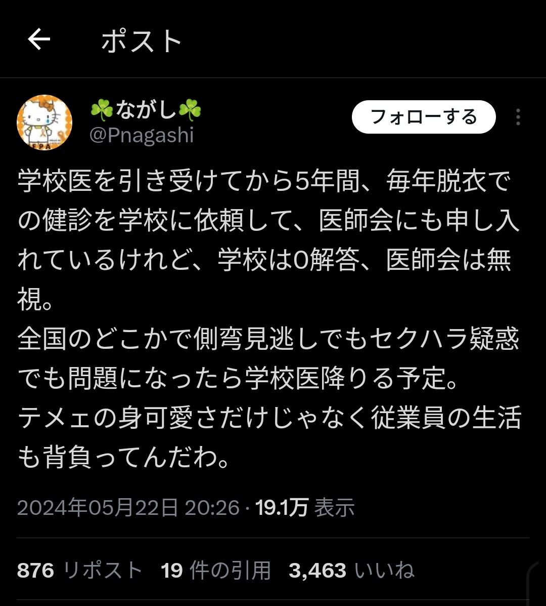 【地獄】女児健診で医師らブチギレ 医師「色々言われるので学校健診はお断りしています」 2024/5/23 速報 1: — (@kentarotakahash) document.write(” + ”); 関連記事 document.write(” + ”); 続きを読む ——— Source: アルファルファモザイク 【地獄】女児健診で医師らブチギレ 医師「色々言われるので学校健診はお断りしています」