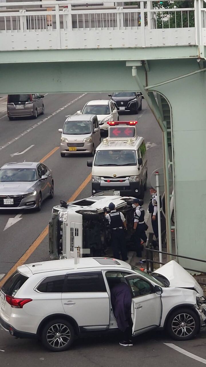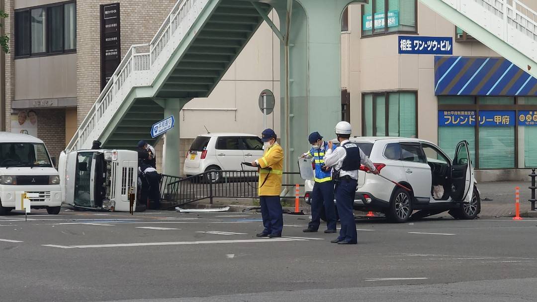 『平和通り 相生交差点車両横転事故です甲府駅方面左折レーンが潰れています』