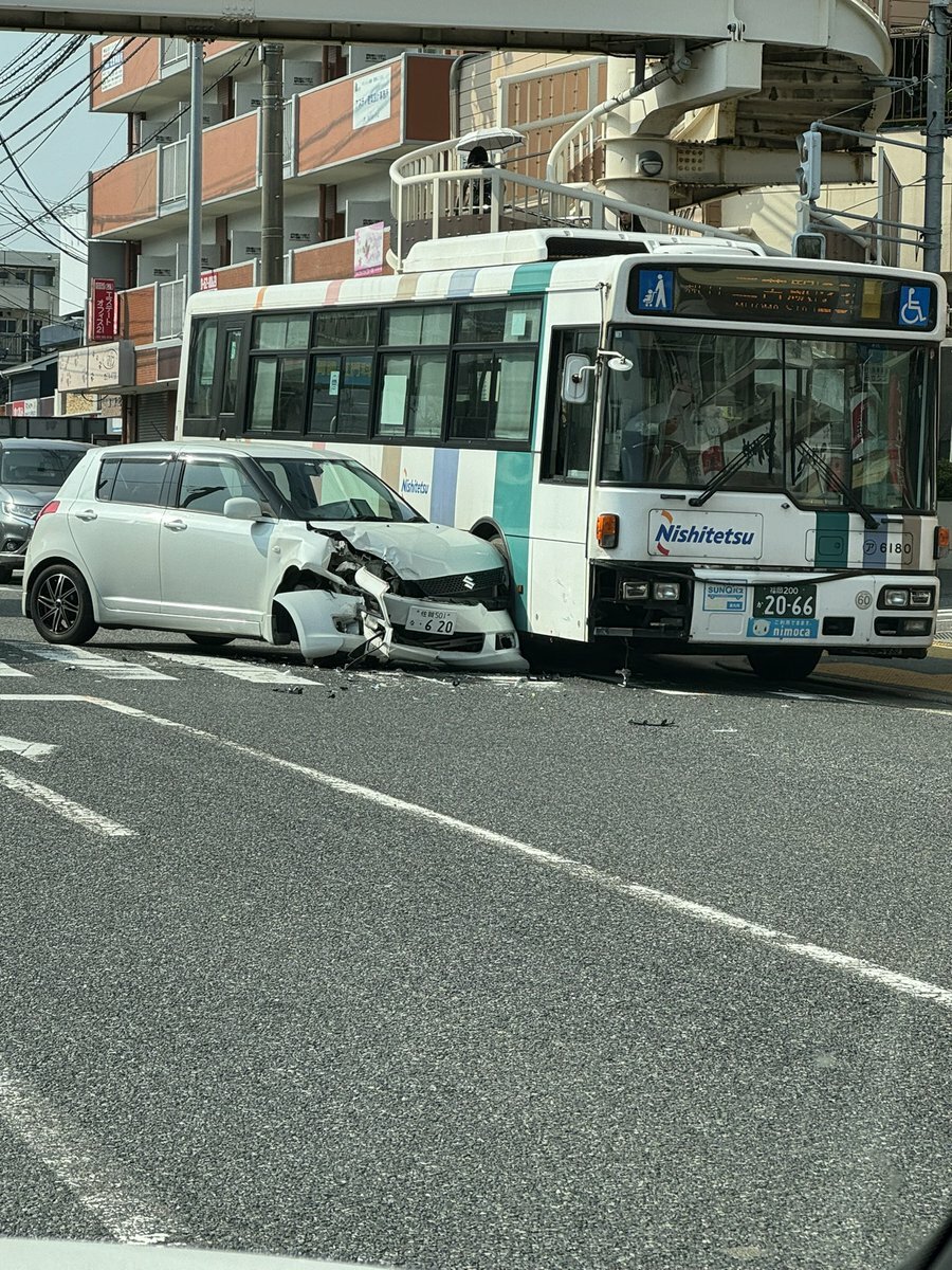 福岡でバスに車が突っ込んで渋滞してた。#事故 #交通事故 #福岡 #西鉄バス pic.twitter.com/vj3AGEYi0Y