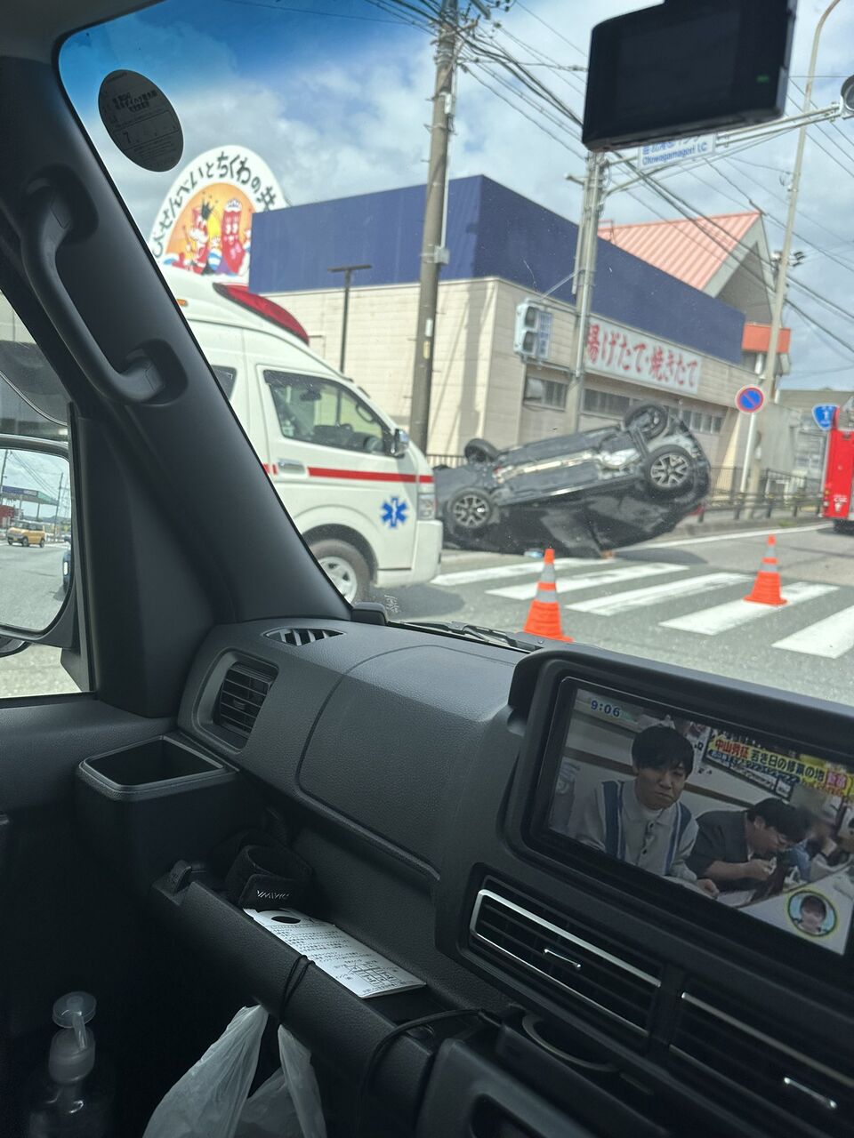 音羽蒲郡インターのとこの交差点で車ひっくり返ってたんやけど