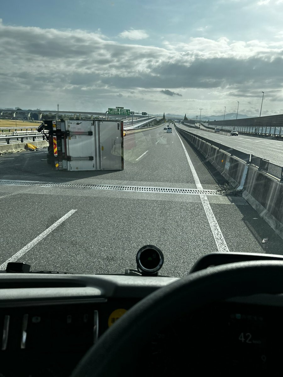 豊田JCTでトラックひっくり返ってた pic.twitter.com/QnJbRxrF2F