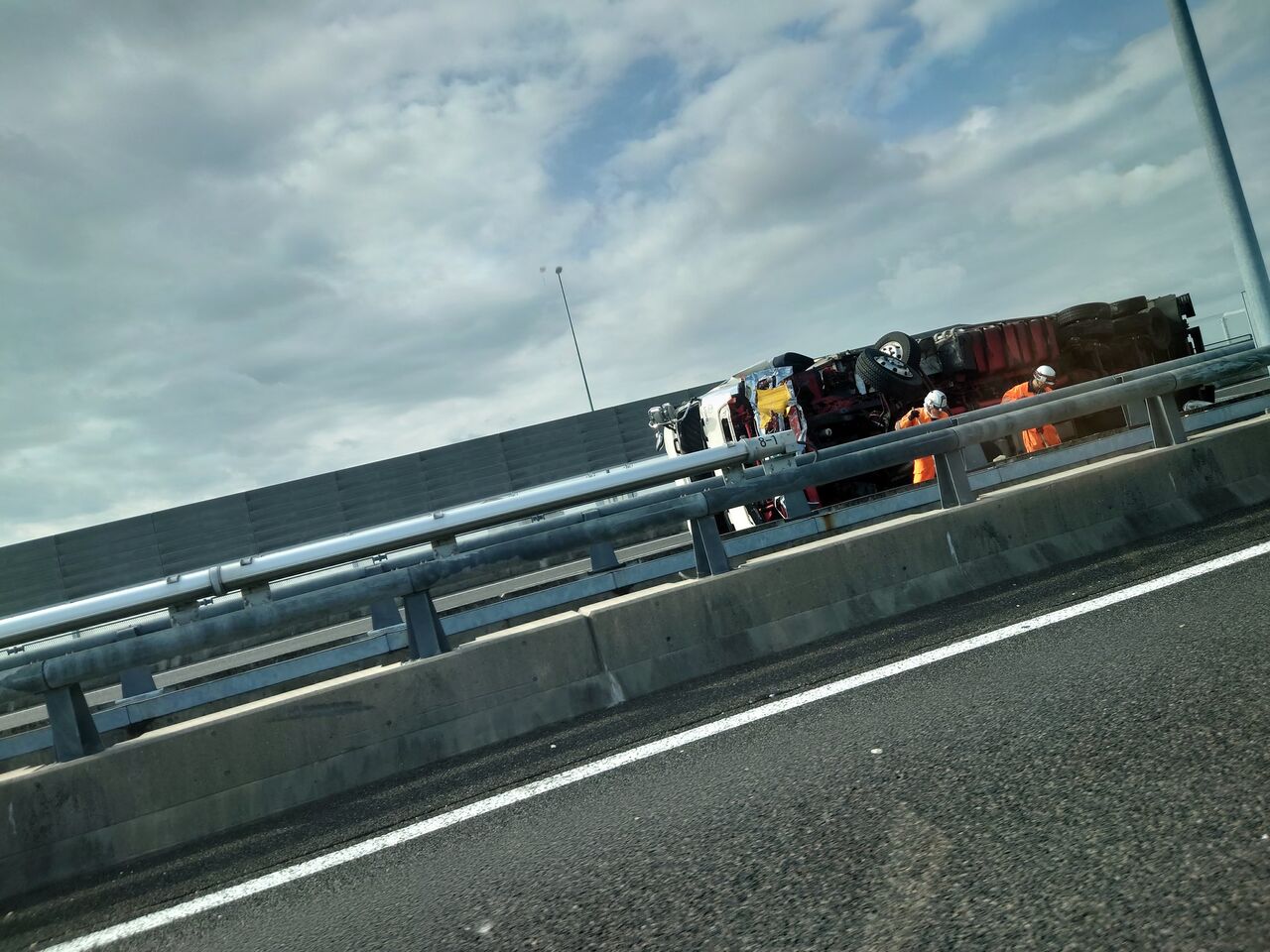 『伊勢湾岸道上り、豊田JCTの所で大型が横転して二車線塞いでます。