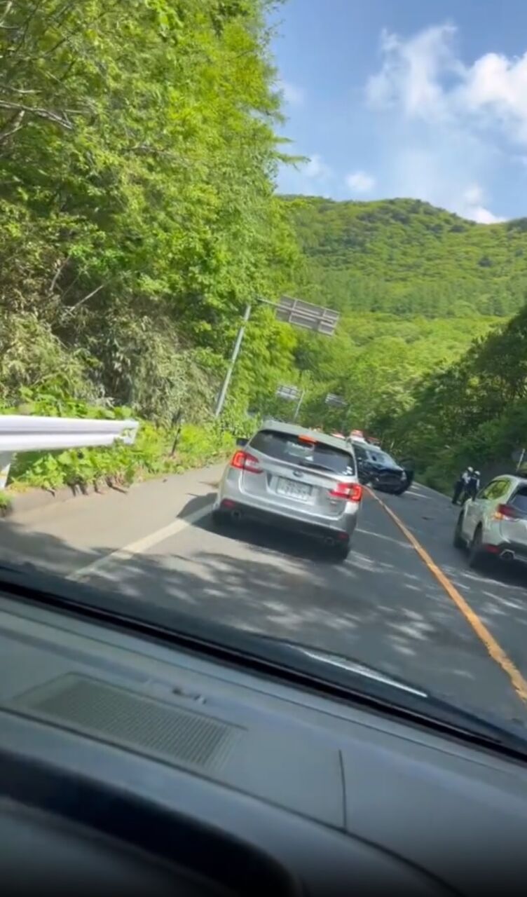 【現場の様子】#交通情報 #国道115号 福島市土湯温泉町 土湯峠 東鴉川橋付近 破片散乱する自動車バイク衝突事故で車線規制渋滞5月26日 #渋滞 #福島 #土湯