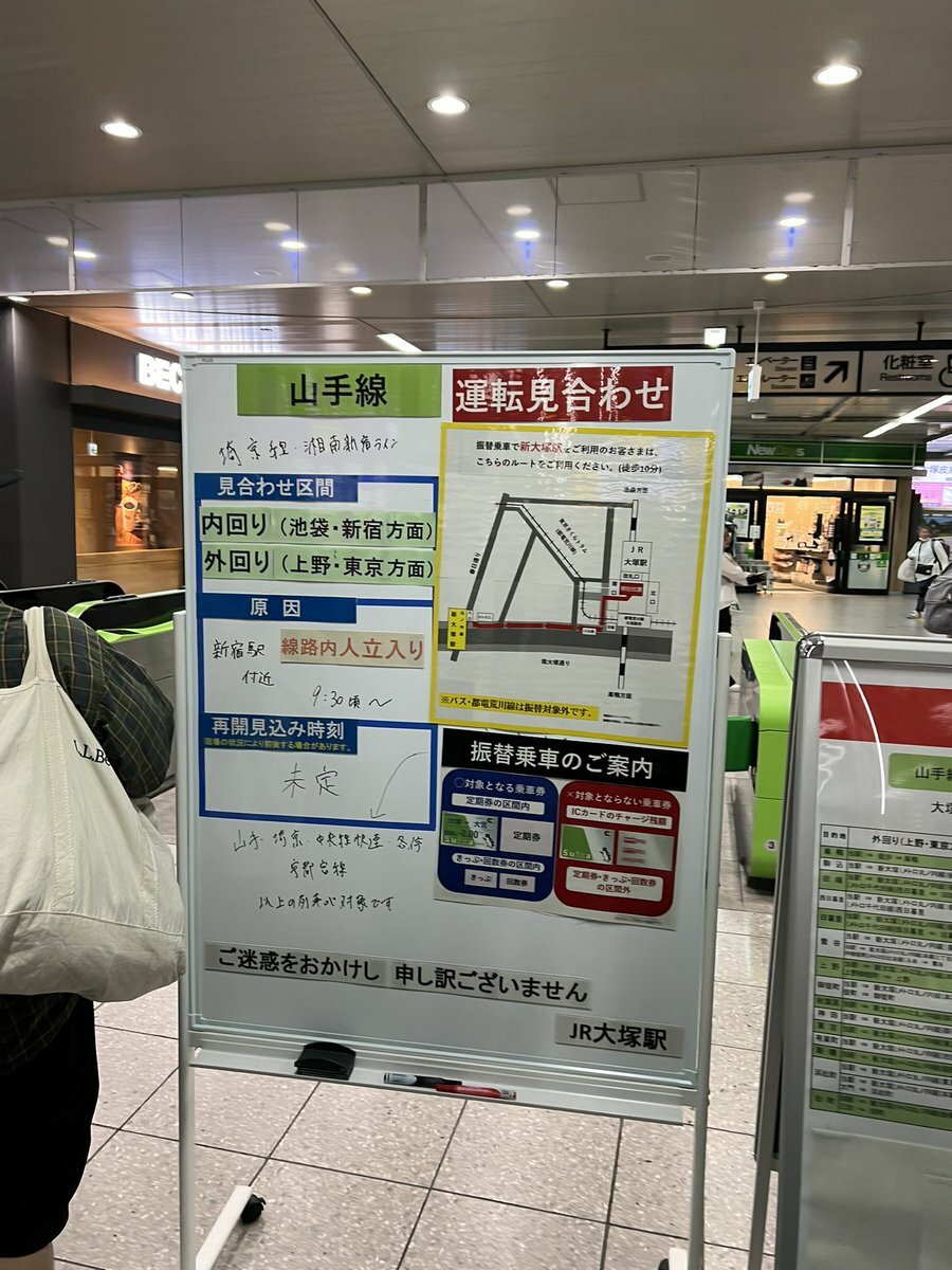 山手線は、埼京線内での線路に人立入の影響で、内・外回り電車に遅れがでています。 #山手線 #Yamanote_Line https://t.co/LojididwyV— JR東日本【東海道方面】運行情報 (公式) (@JRE_F_Tokaido) May 27, 2024