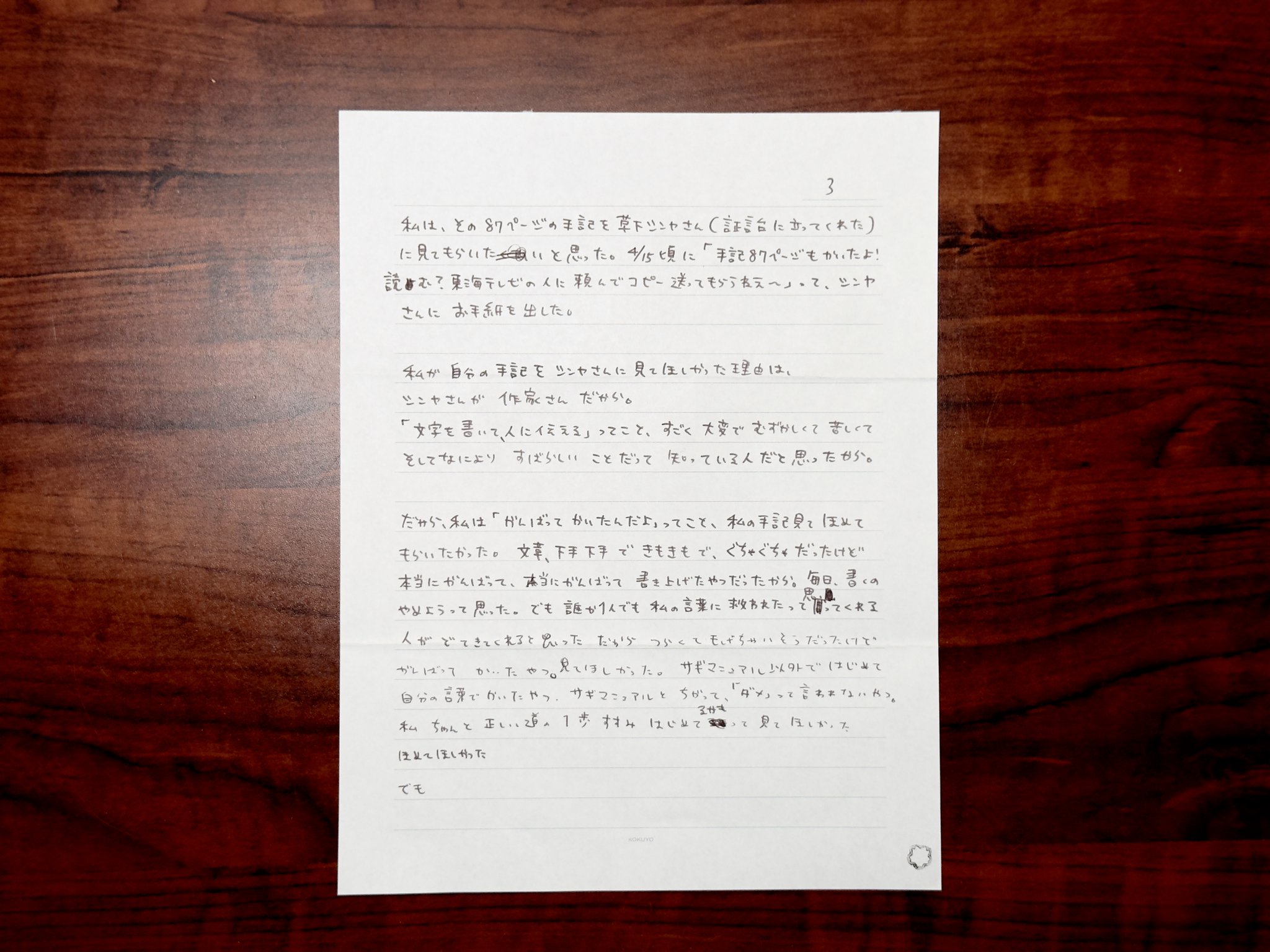 だから、私は「がんばってかいたんだよ」ってこと、私の手記見て ほめてもらいたかった。文章、下手下手できもきもで、ぐちゃぐちゃだったけど 本当にがんばって、本当にがんばって書き上げたやつだったから。