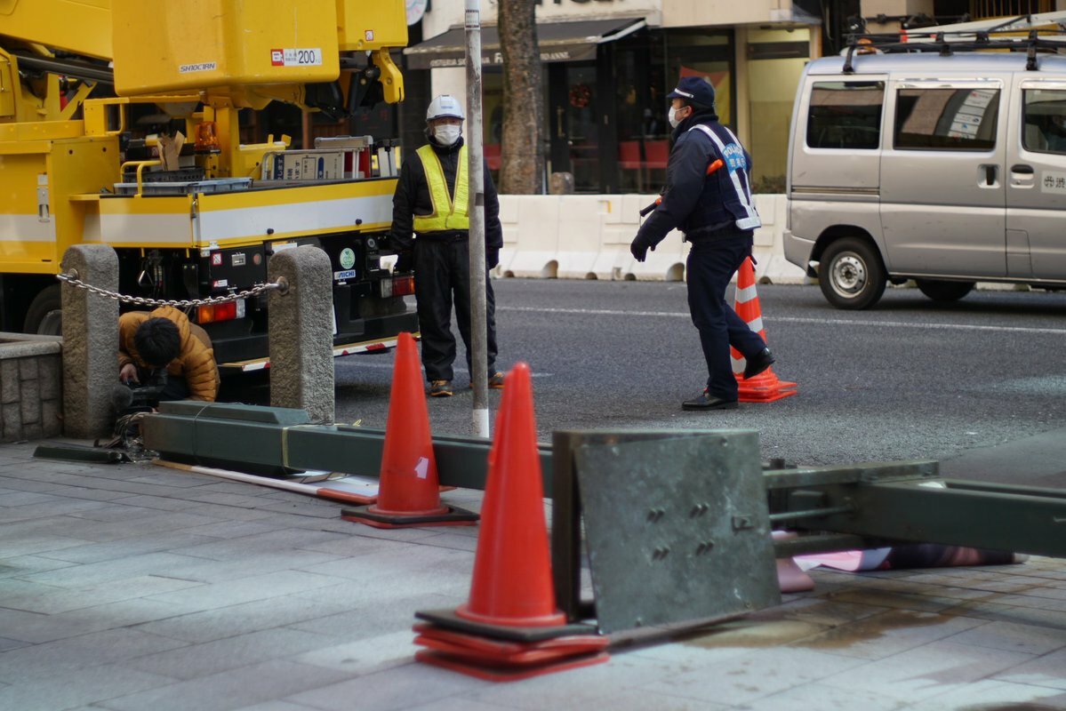 道玄坂に警察がなんか囲ってるなぁ、と思ったら、街灯が倒れっとった。風のせいで…?マ…?