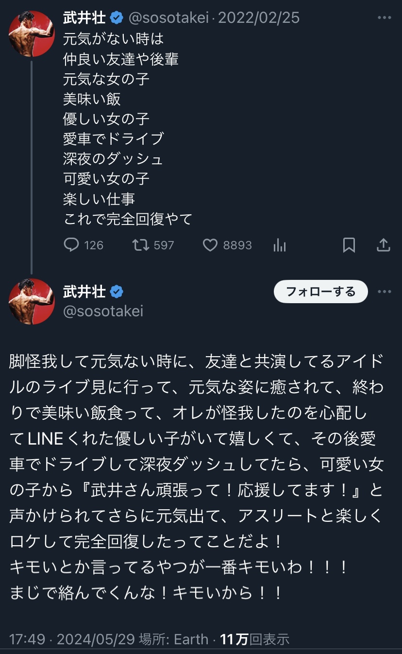 【衝撃事実】武井壮さんの例のツイート、こういう事だったwwwwwww 2024/5/30 速報 1: https://x.com/sosotakei/status/1795739222143606805?s=46&t=Ejg7i2EUfRl_1w444u7ydw document.write(” + ”); 関連記事 document.write(” + ”); 続きを読む ——— Source: アルファルファモザイク 【衝撃事実】武井壮さんの例のツイート、こういう事だったwwwwwww