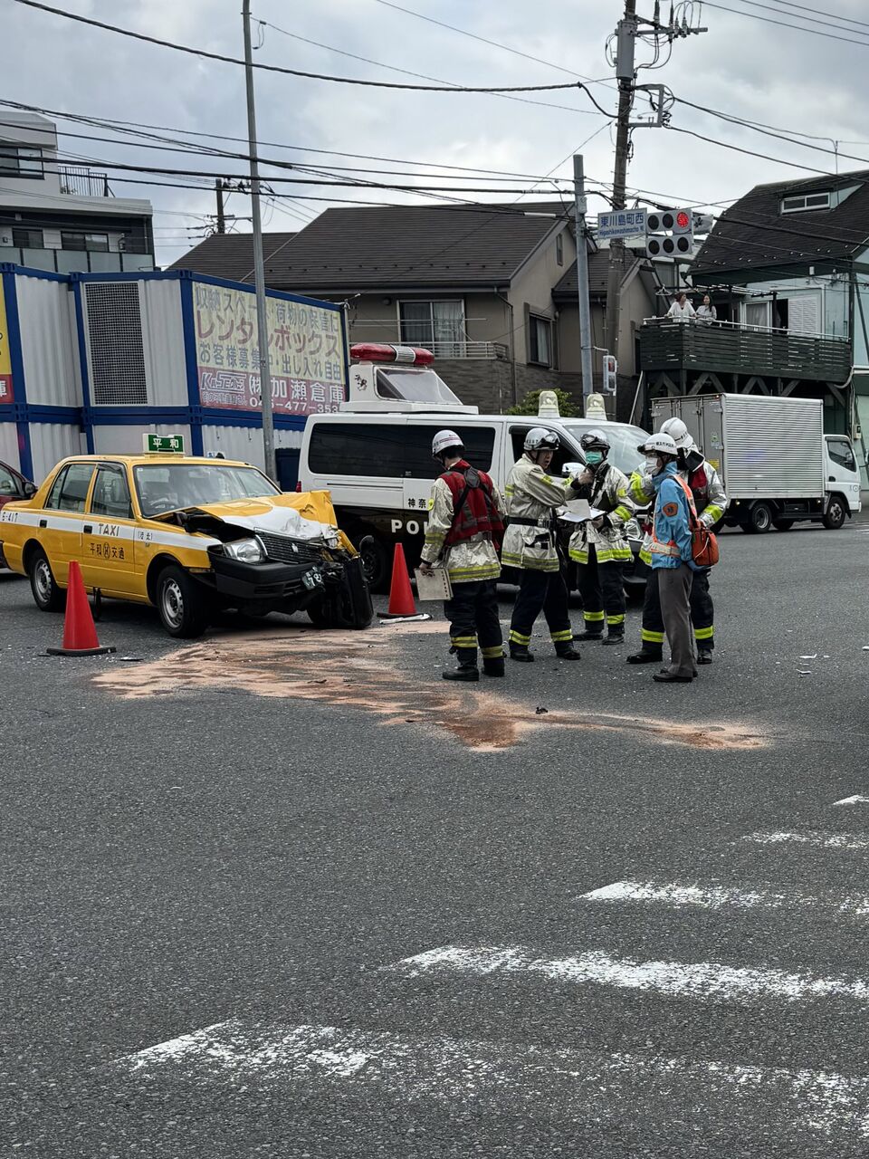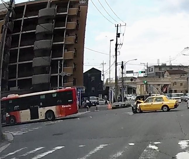交差点の真ん中でタクシーと路線バスが事故を起こしたため大渋滞してます。この事故のせいで片側交互通行のような感じになっているので抜けるまでかなり時間がかかる模様。