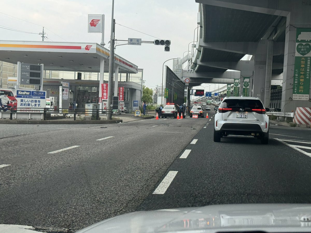事故で三車線中二車線塞がってます。どうしてこうなった。#国道23号#事故 pic.twitter.com/7xS1MPGulS