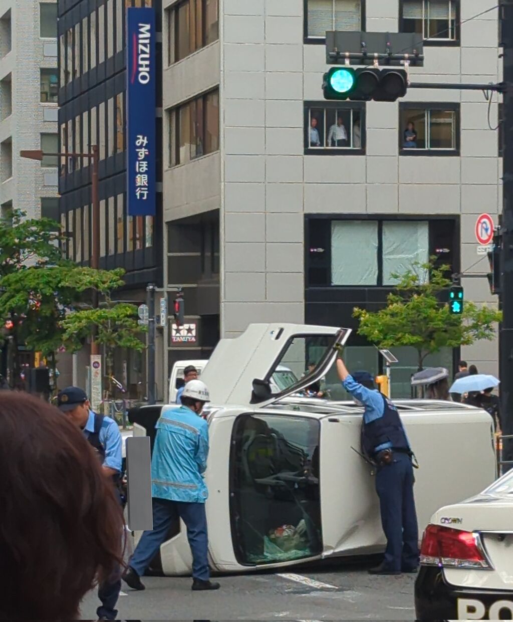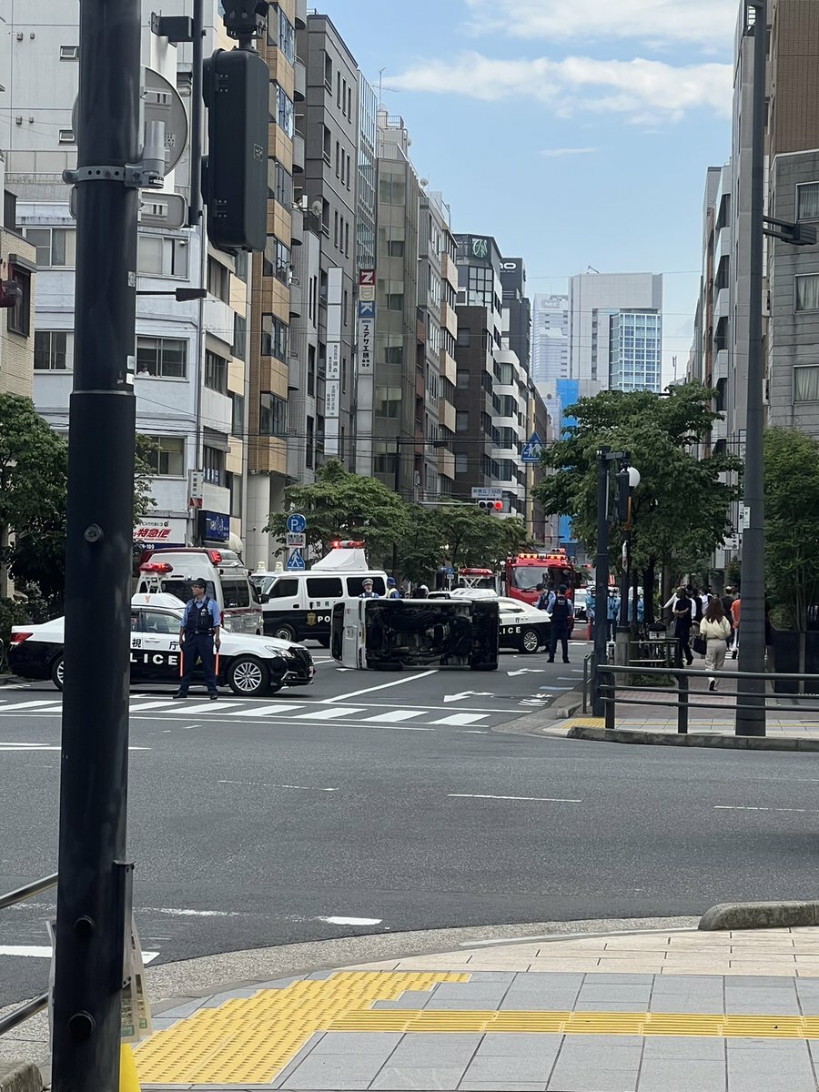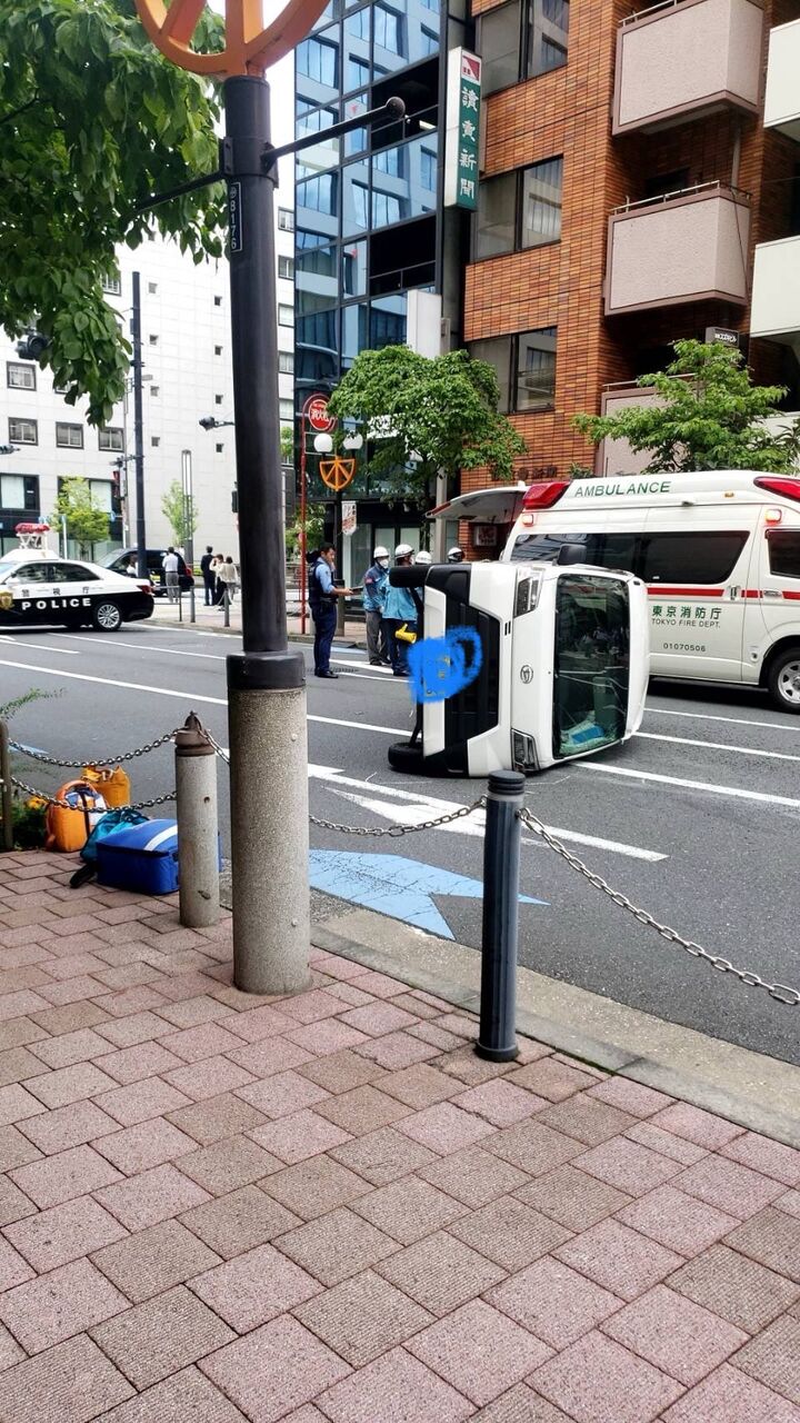 用事で新橋いるけど、パトカーあって何事??ってなってみたら車が横転してたわ