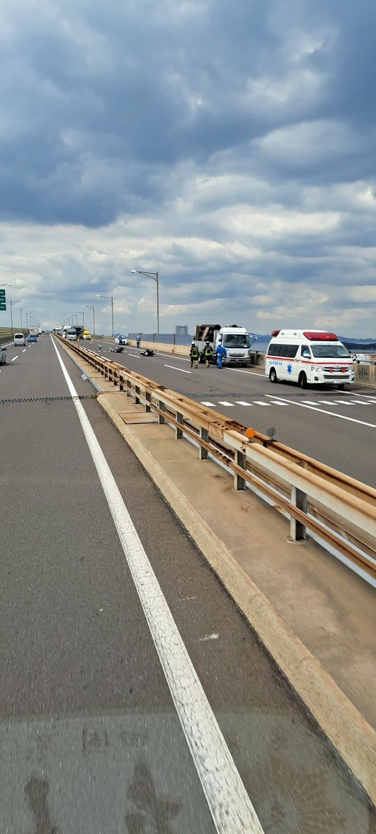 『あじゃー、高速道路瀬戸大橋下り線でバイク?で事故があったのか、通行止めになってる。