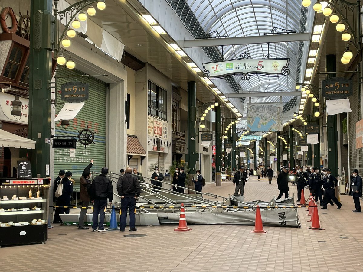 三ノ宮と元町の間のアーケードのある商店街で、5mの足場がバタンといってしまうて、そりゃセンター街やなかろか。。。— Jizi_t (@Jizi_t) February 27, 2024