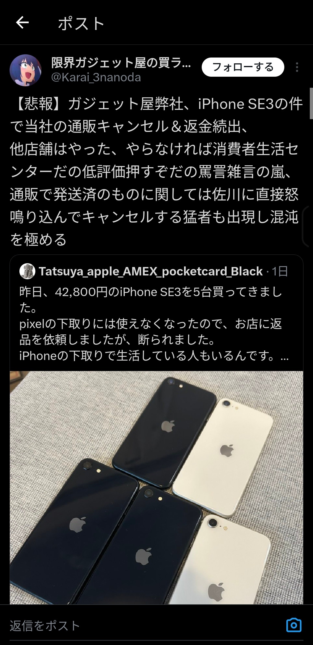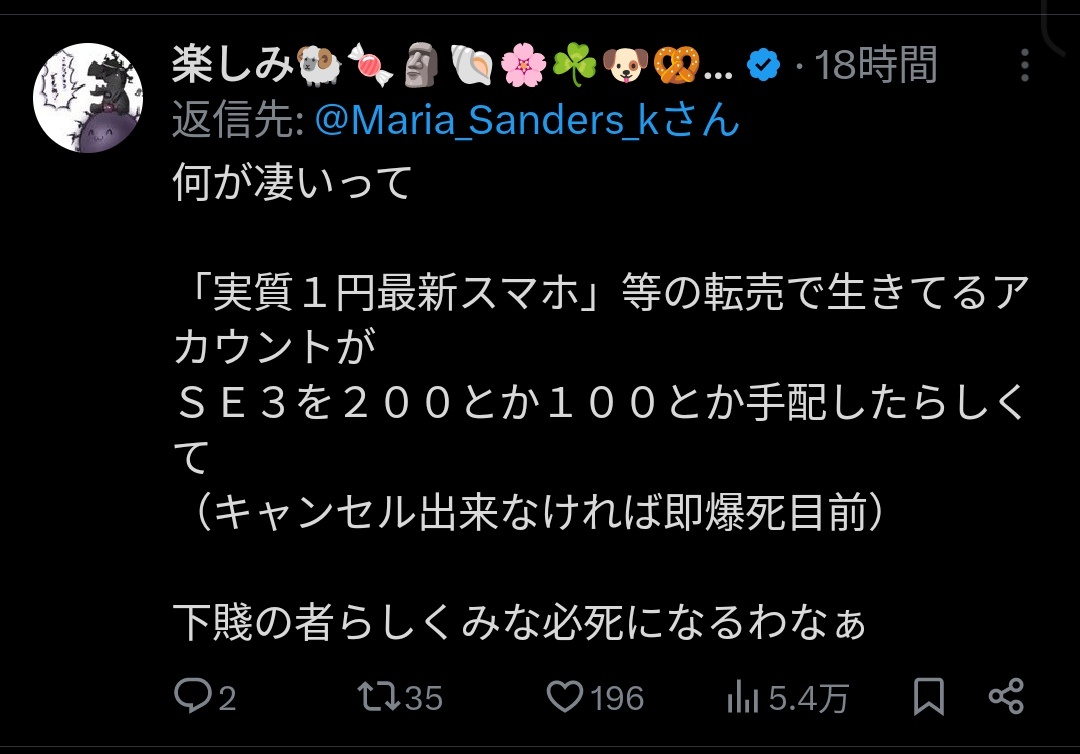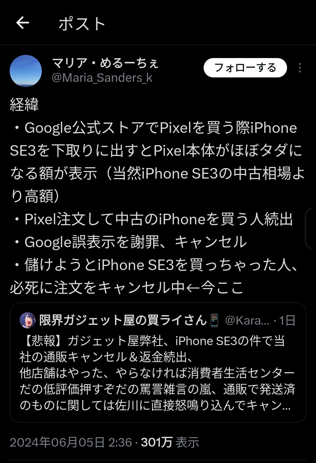 【策士】iPhone SE3買取でPixel 8a実質無料→グーグル「間違えたわキャンセルな」→SE3買い占めた転売ヤー阿鼻叫喚 2024/6/6 速報 1: はい https://ascii.jp/elem/000/004/201/4201970/ document.write(” + ”); 関連記事 document.write(” + ”); 続きを読む ——— Source: アルファルファモザイク 【策士】iPhone SE3買取でPixel 8a実質無料→グーグル「間違えたわキャンセルな」→SE3買い占めた転売ヤー阿鼻叫喚