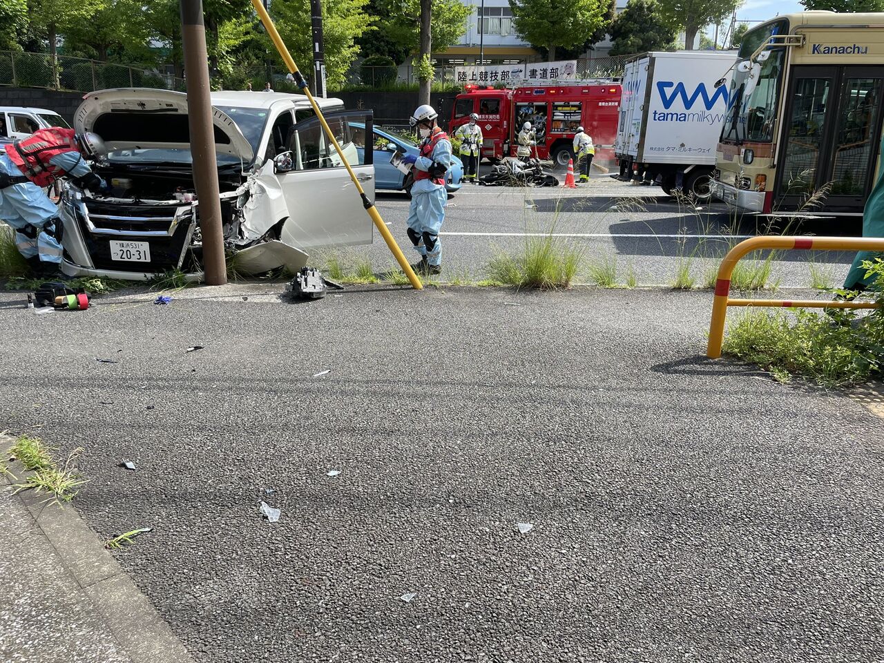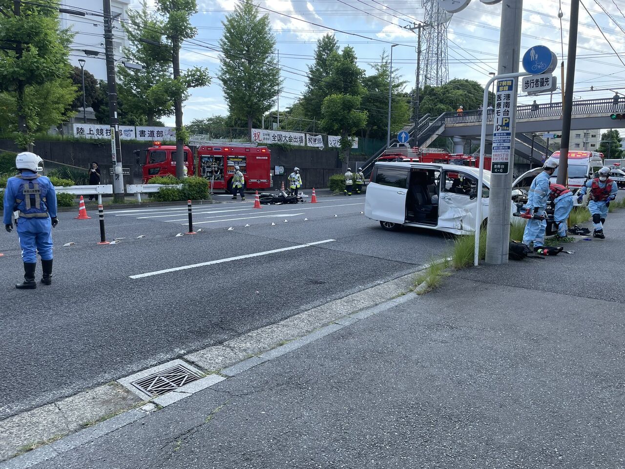 【現場の様子】#交通情報 横浜環状3号線 横浜市港南区 #京浜東北根岸線 港南台駅南側 明朋高校交差点付近バイクと自動車衝突大破事故で一時通行止 神奈中バスなど遅延6月7日 #横浜 #港南台
