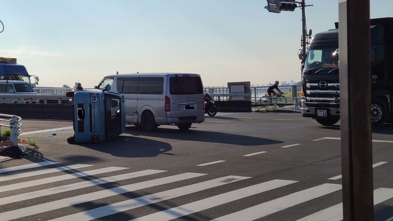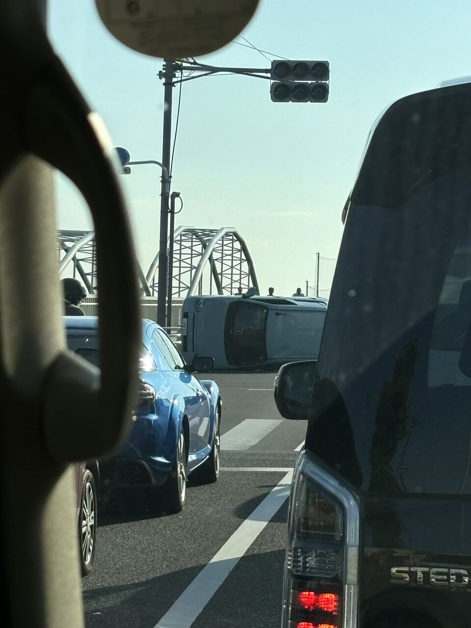 【現場の様子】#交通情報 鶴川街道 東京都稲城市矢野口駅東→多摩川原橋付近 車線塞ぐ衝突横転事故で規制渋滞6月11日 #渋滞 #稲城 #多摩川