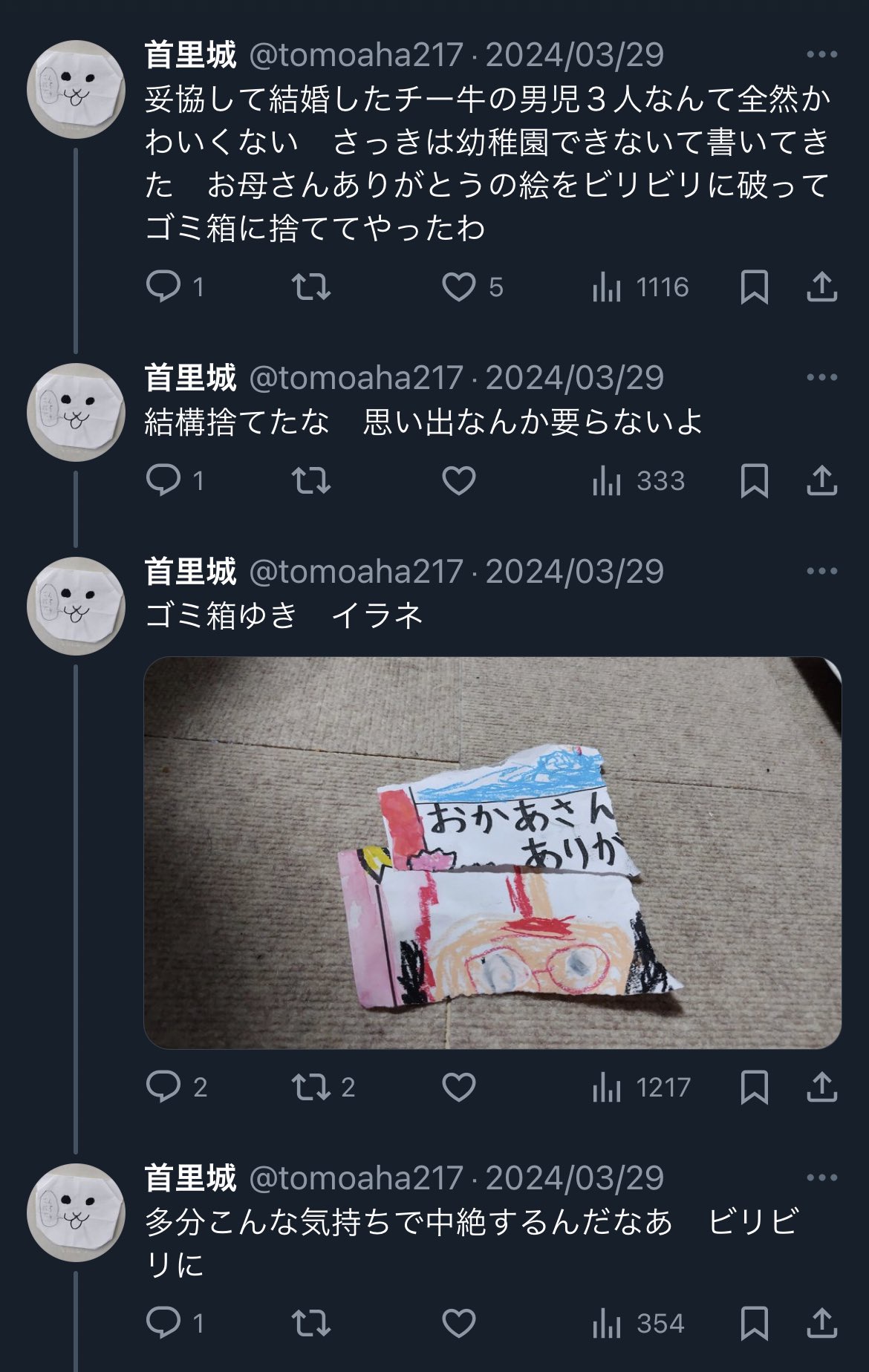 【地獄絵図】チー牛と「妥協」して結婚&子づくりしてしまった女性、発狂して子供の描いた絵を破り捨ててしまう… 2024/6/11 速報 1: ソース 日本人怖っ😨 document.write(” + ”); 関連記事 document.write(” + ”); 続きを読む ——— Source: アルファルファモザイク 【地獄絵図】チー牛と「妥協」して結婚&子づくりしてしまった女性、発狂して子供の描いた絵を破り捨ててしまう…
