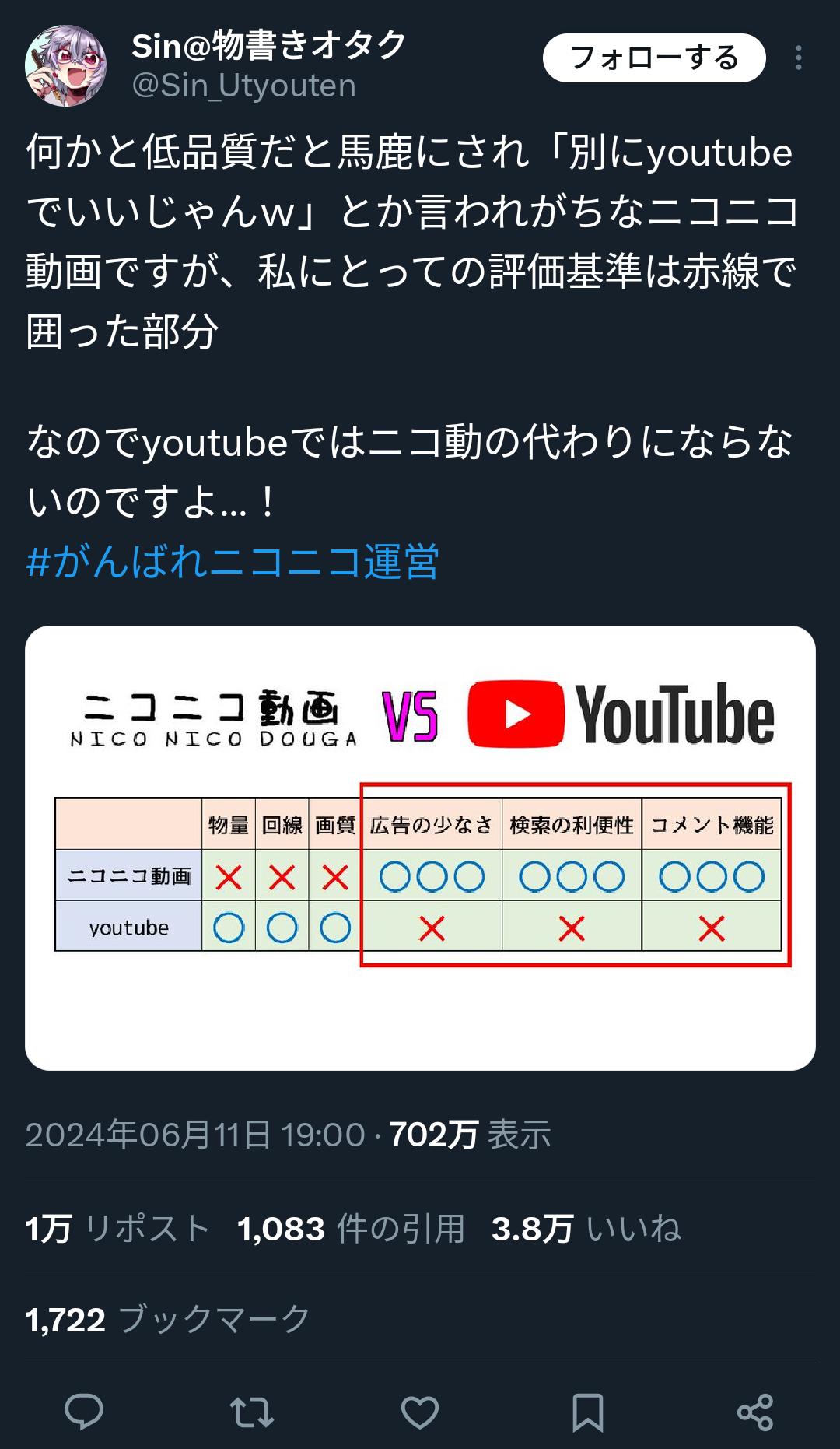 【衝撃事実】ニコニコ動画、実はYouTubeより圧倒的に有能なことが判明wwwwwwww 2024/6/12 速報 1: document.write(” + ”); 関連記事 document.write(” + ”); 続きを読む ——— Source: アルファルファモザイク 【衝撃事実】ニコニコ動画、実はYouTubeより圧倒的に有能なことが判明wwwwwwww