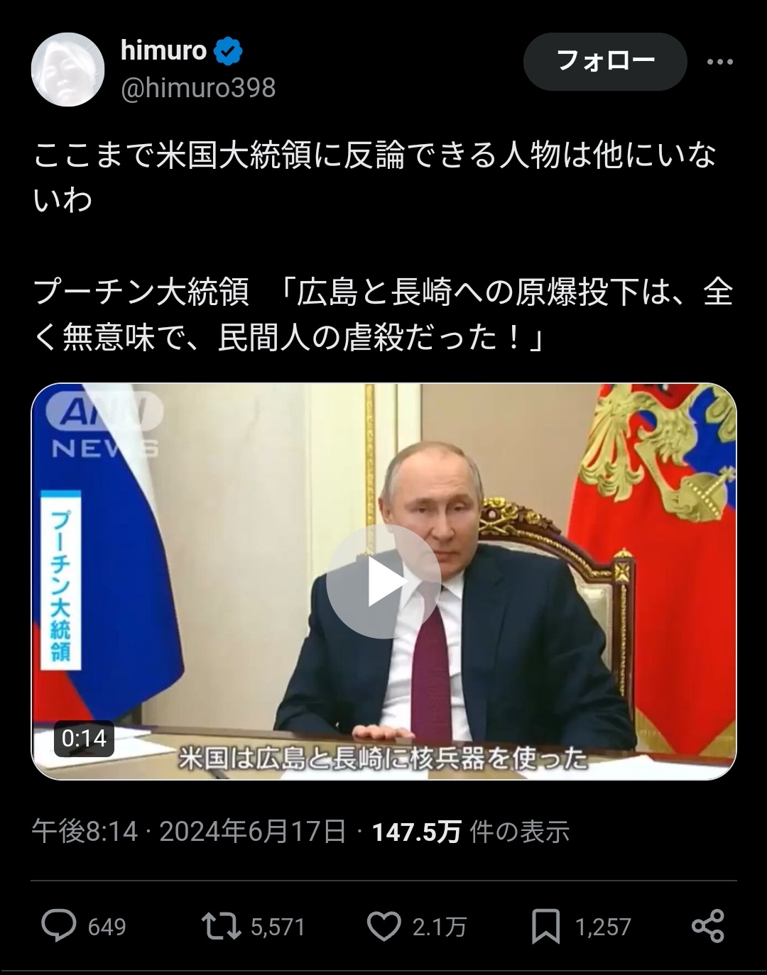 【悲報】アメリカ「原爆投下は正義」プーチン「ただの民間人の虐殺だ」 2024/6/18 速報 1: document.write(” + ”); 関連記事 document.write(” + ”); 続きを読む ——— Source: アルファルファモザイク 【悲報】アメリカ「原爆投下は正義」プーチン「ただの民間人の虐殺だ」