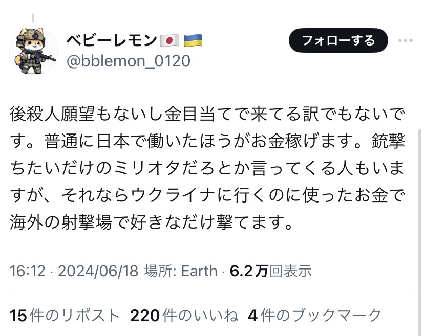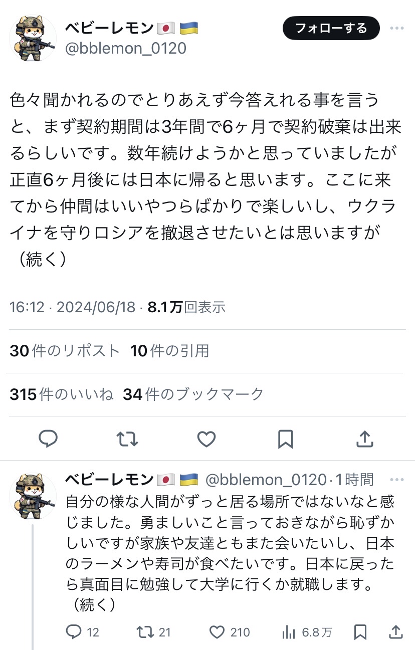 ウクライナの日本人義勇兵、入隊した途端にとんでもない事になってしまう 2024/6/18 速報 1: ウクライナ軍に入隊した18歳日本人義勇兵、帰国を決意 document.write(” + ”); 関連記事 document.write(” + ”); 続きを読む ——— Source: アルファルファモザイク ウクライナの日本人義勇兵、入隊した途端にとんでもない事になってしまう