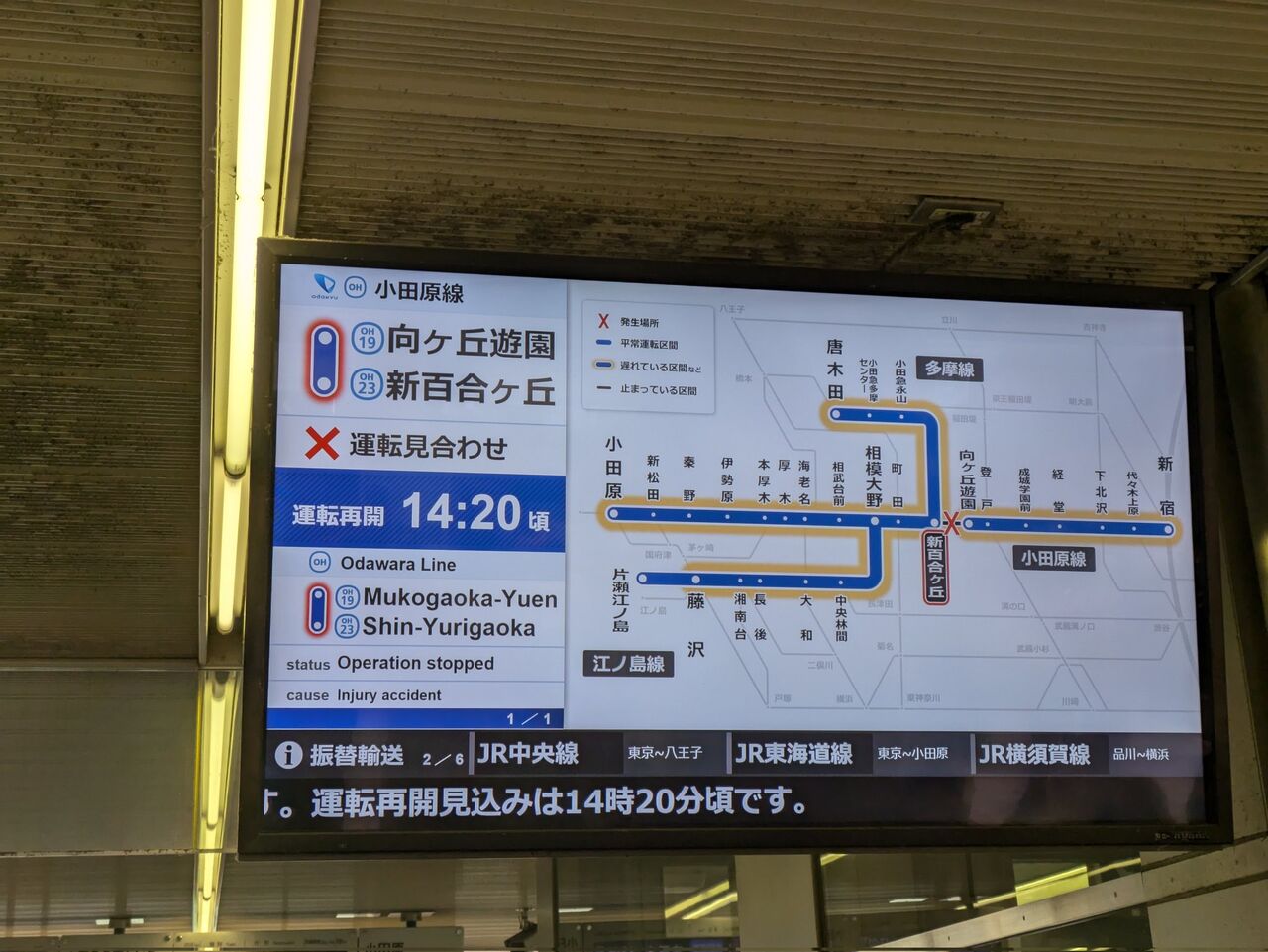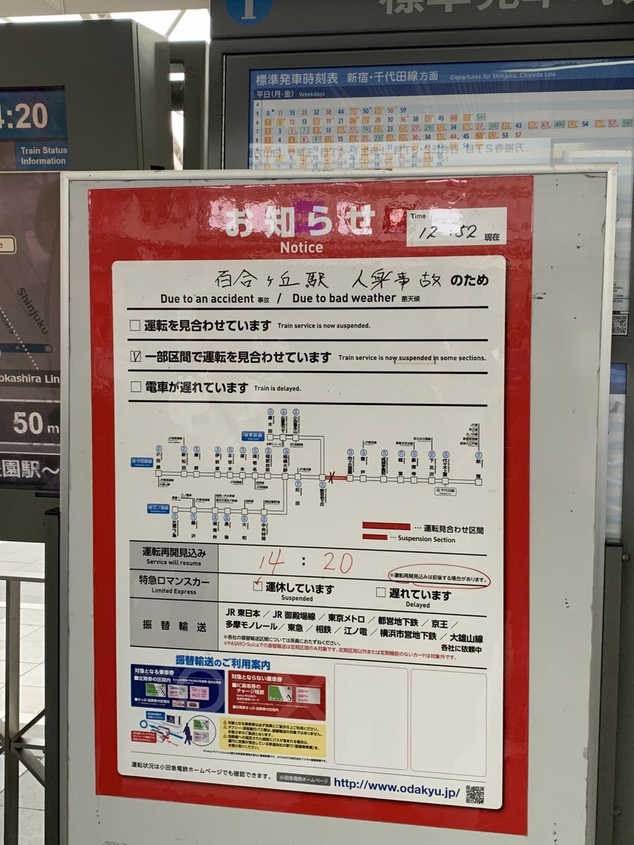 【小田急小田原線】12:52頃、百合ケ丘駅で発生した人身事故の影響で、向ケ丘遊園〜新百合ケ丘駅間の運転を見合わせててぴえん🥺 運転区間の一部列車に遅れが出てる。振替輸送を行ってる pic.twitter.com/SkBJf6xlz5