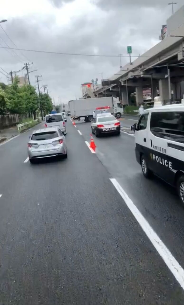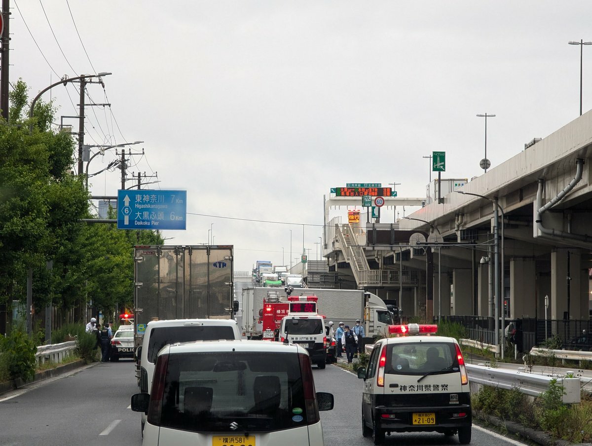 【現場の様子】#交通情報 産業道路 神奈川県横浜市鶴見区小野町付近 大型トラックとバイク衝突事故で一時通行止め渋滞6月21日 #渋滞 #横浜 #鶴見 #バイク