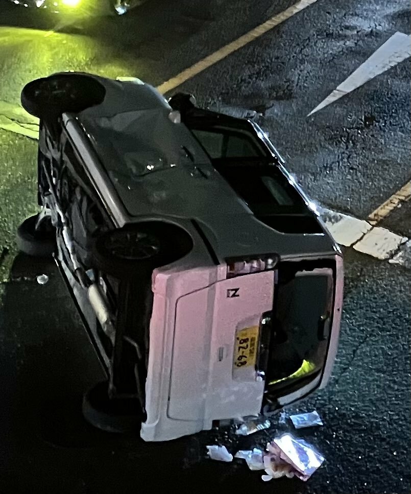 『乗用車同士の衝突事故発生❗️車、横転しています。近くを通る方、ご注意下さい。』