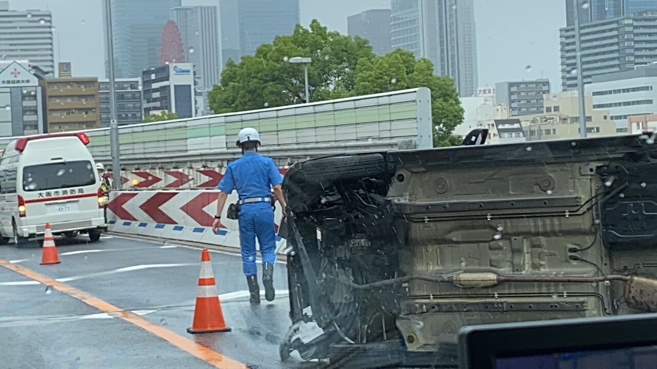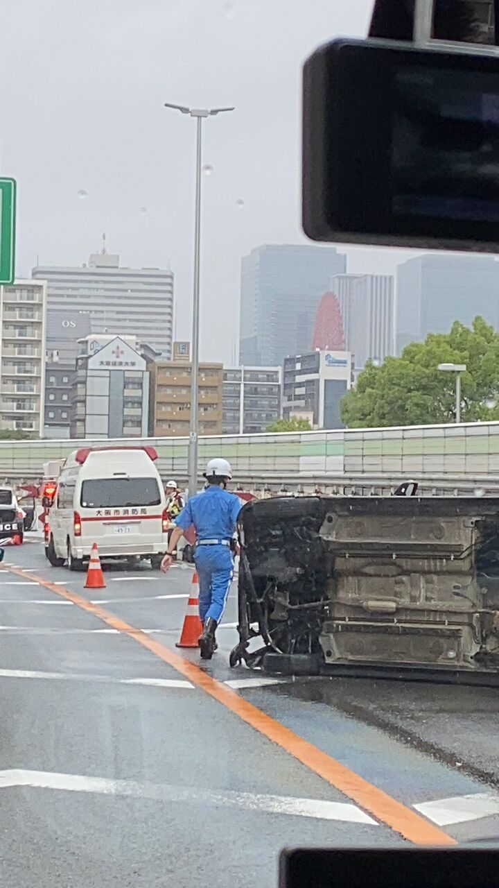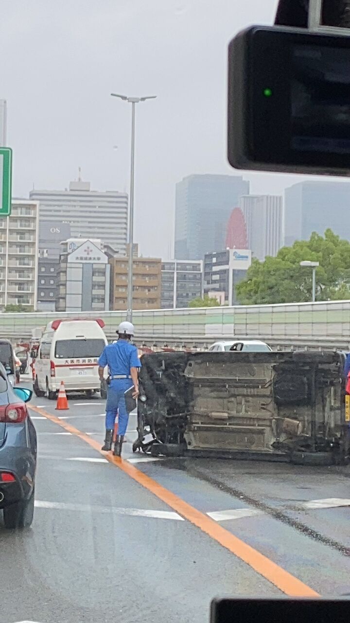梅雨入りしたのもあってここ10日で3回以上事故みたが、今日はでかい音したと思ったら横転事故やった。