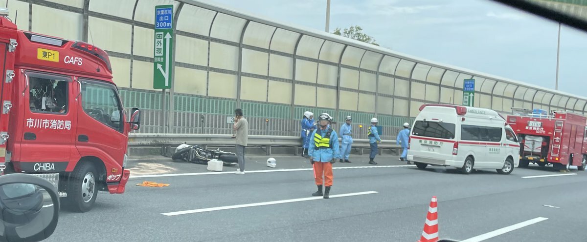 京葉道路下りの江戸川大橋先の外環分岐手前のバイクと車の事故?渋滞がエグかった