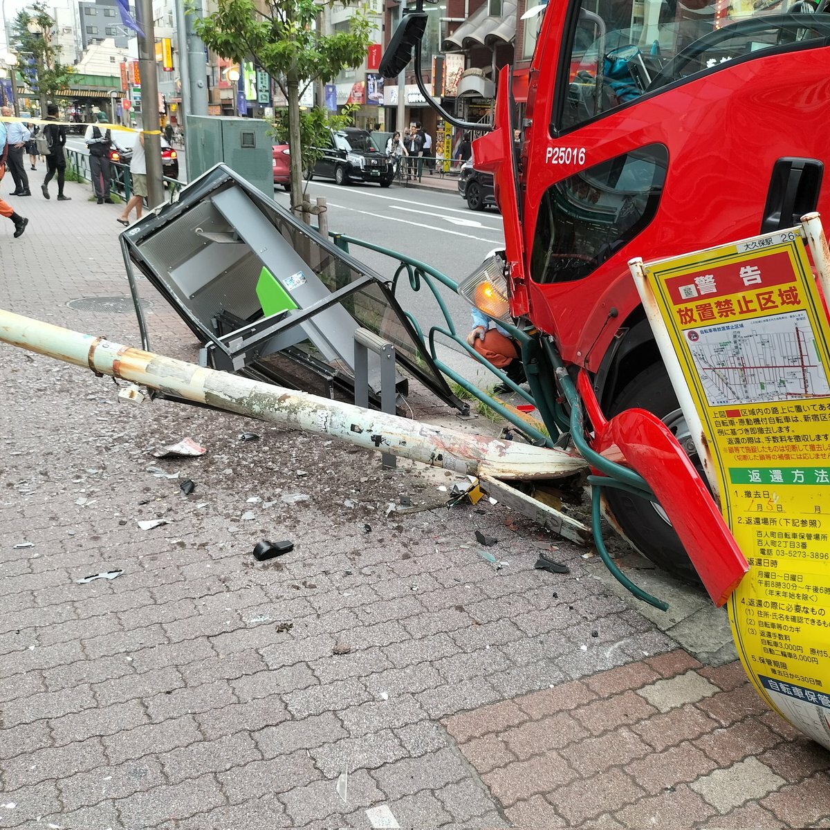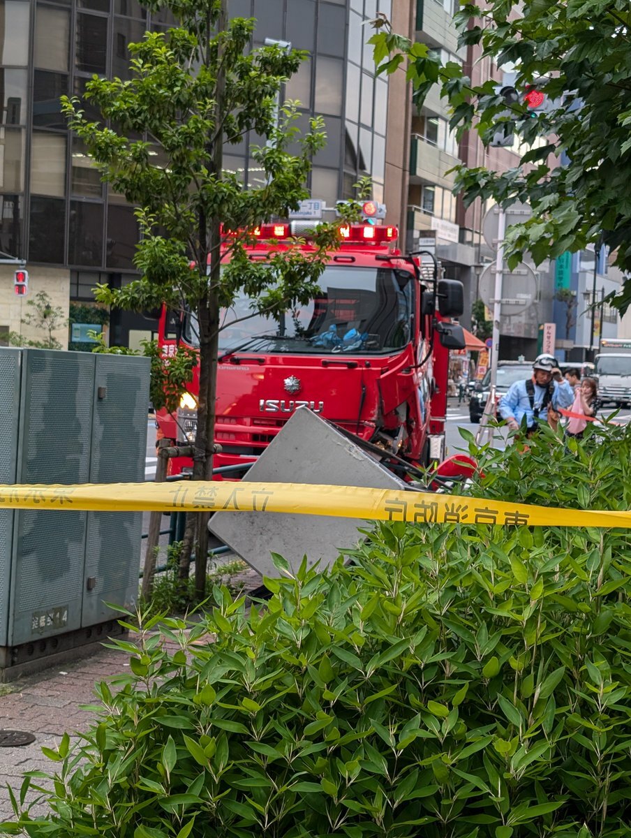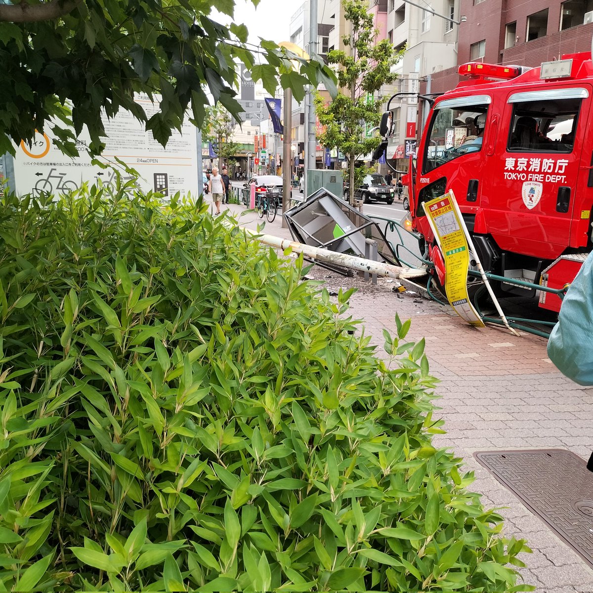 【現場の様子】#交通情報 大久保通り 東京都新宿区百人町2丁目まいばすけっと北新宿1丁目交差点付近 消防車が歩道ガードレール突っ込み電話ボックス破壊事故規制渋滞6月25日 #消防車