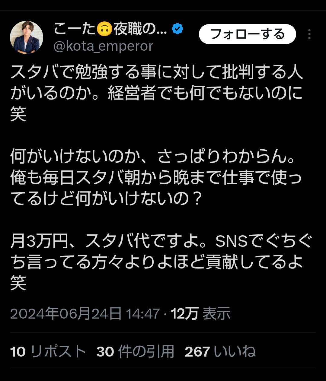 【公開処刑】スタバで月3万使う経営者、イキる 2024/6/26 速報 1: — (@yummy_emi) document.write(” + ”); 関連記事 document.write(” + ”); 続きを読む ——— Source: アルファルファモザイク 【公開処刑】スタバで月3万使う経営者、イキる