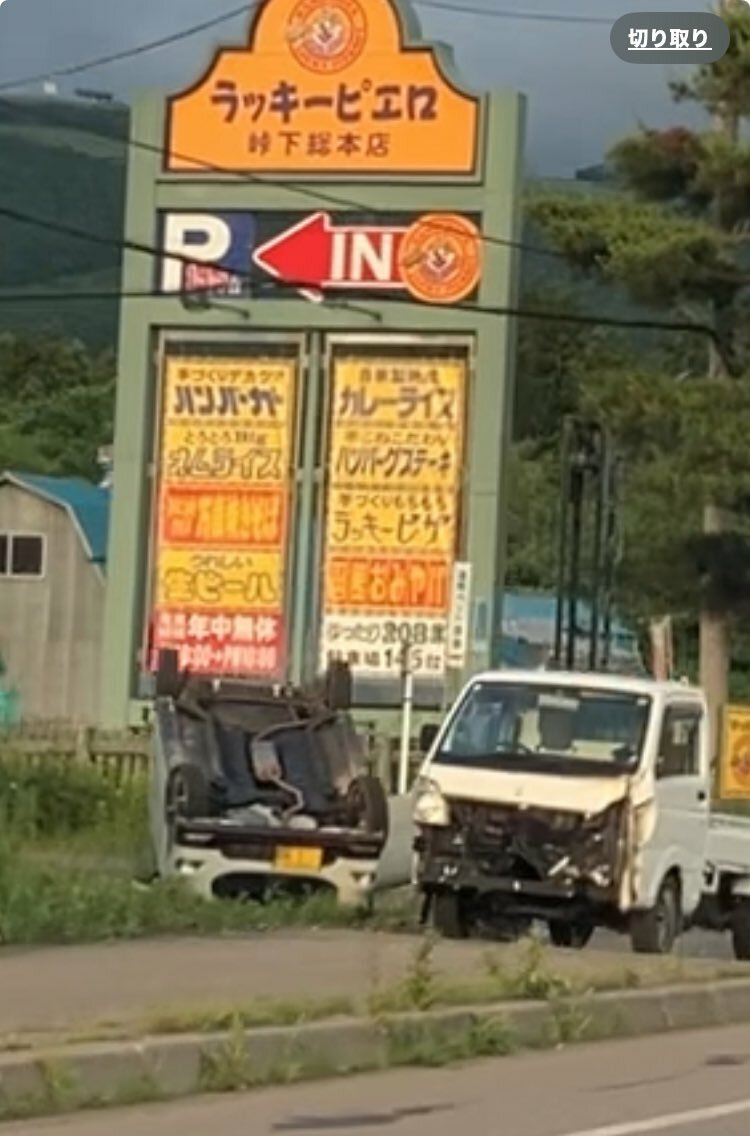 峠下のラッキーピエロ付近で車が横転してだよ!