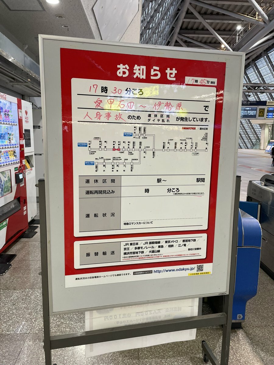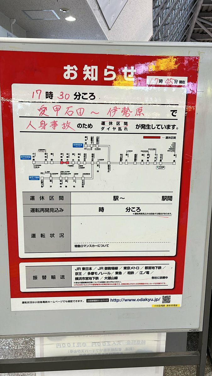 小田急人身事故のため本厚木〜伊勢原運転見合わせ