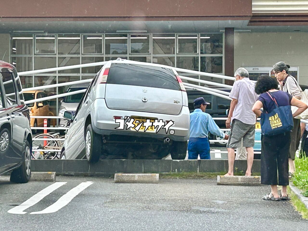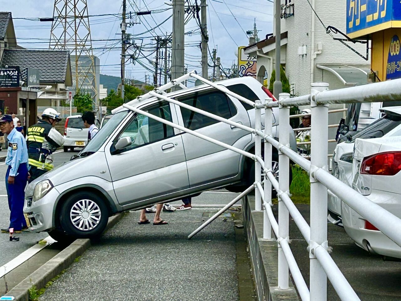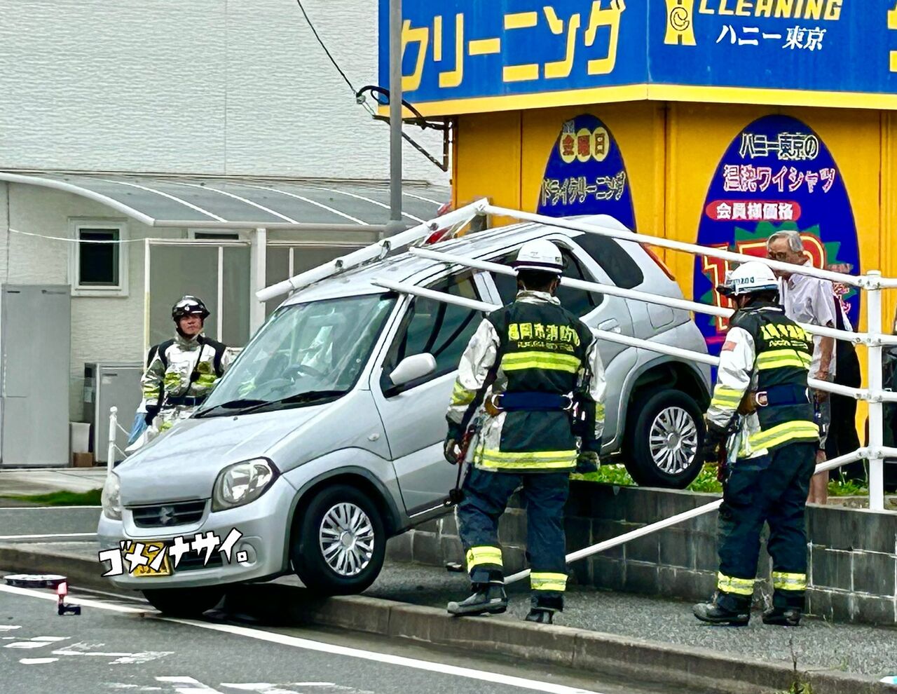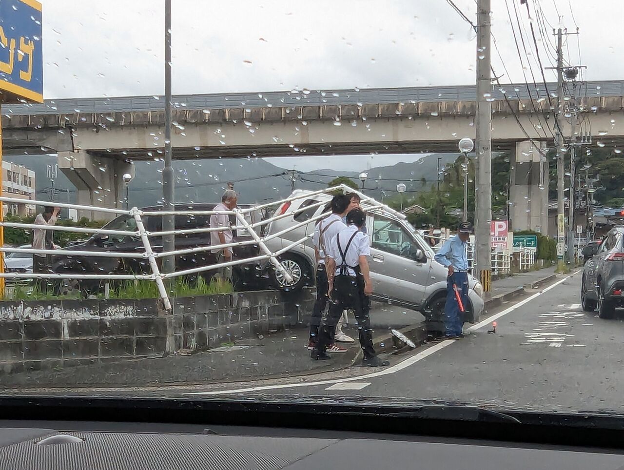 【現場の様子】#交通情報 福岡市西区今宿東1丁目スーパールミエール今宿店付近 クリーニング店駐車場ガードレールを突き破る事故6月30日 #福岡 #西区 #今宿