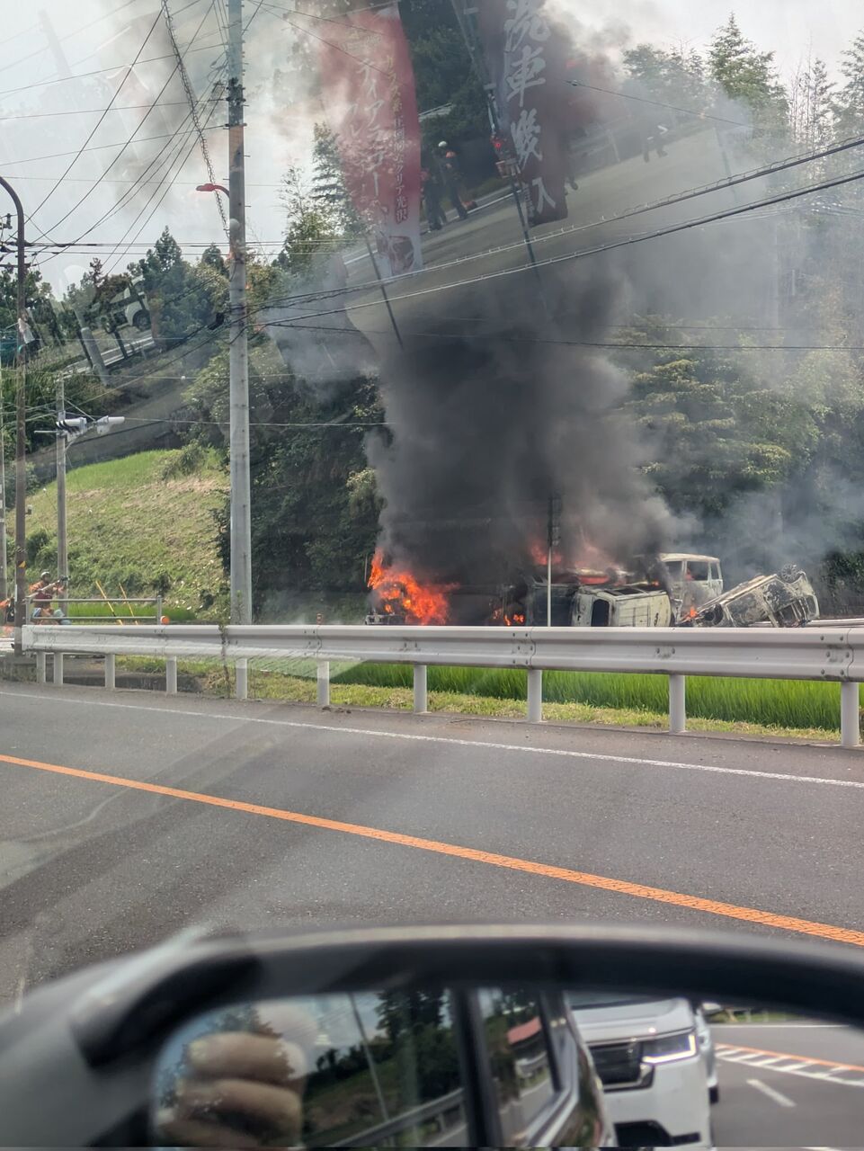 『湯津上に行こうとしたら、国道400号線蛭畑交差点で車両火災。』