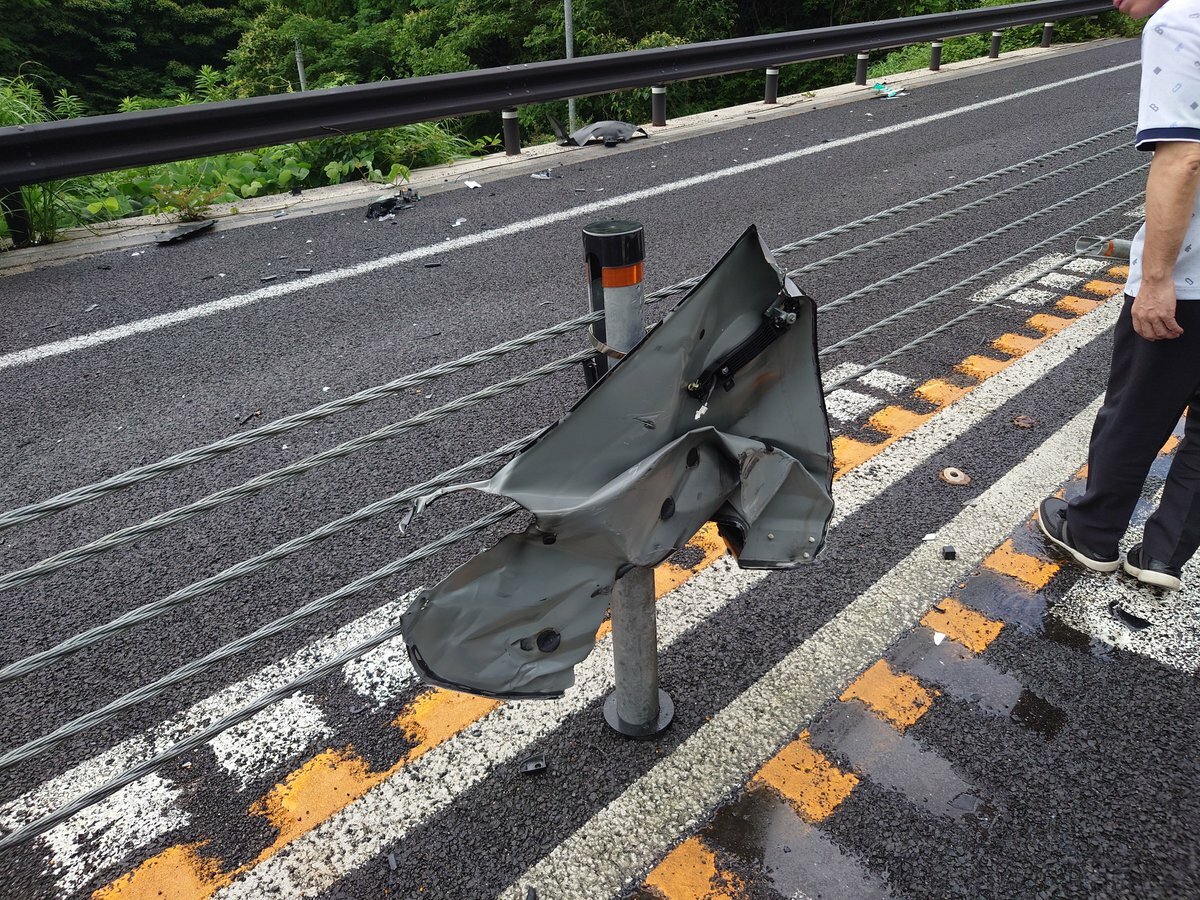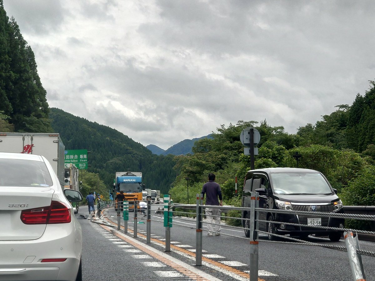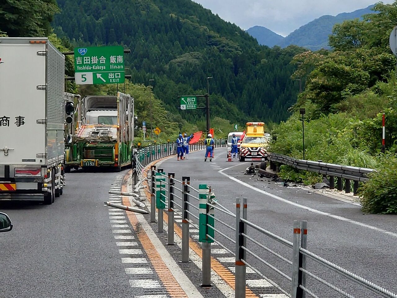 『今公団職員が反対車線に飛び散ったガレキを拾い集めてるす。事故車はレッカーに積んでる最中ぽいす』