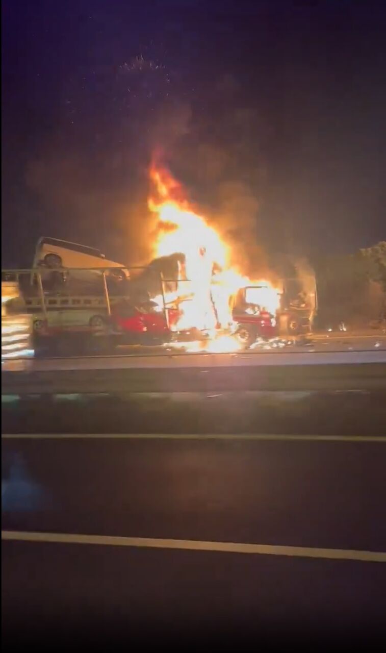 『東北道下り23キロポスト付近。追い越し車線で1台横転、路肩でキャリアカー炎上中』