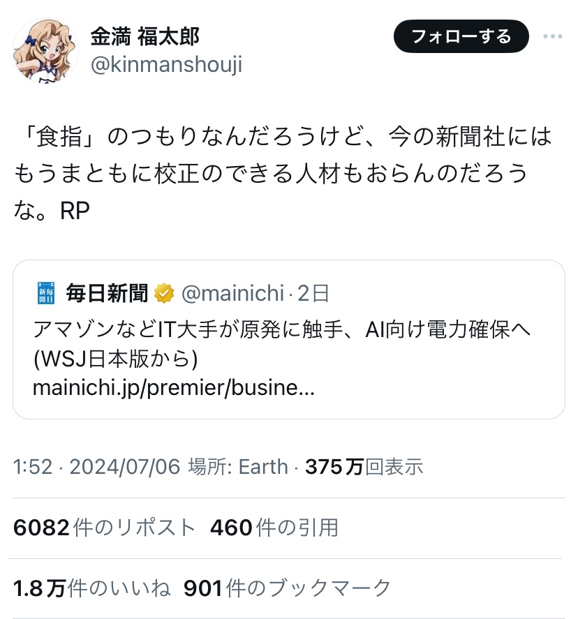 X民「毎日新聞が意味不明な表現使ってて草。もうまともに校正できないんだろうなw」1.8万いいね 2024/7/8 速報 1: 終わりだよこの国 document.write(” + ”); 関連記事 document.write(” + ”); 続きを読む ——— Source: アルファルファモザイク X民「毎日新聞が意味不明な表現使ってて草。もうまともに校正できないんだろうなw」1.8万いいね