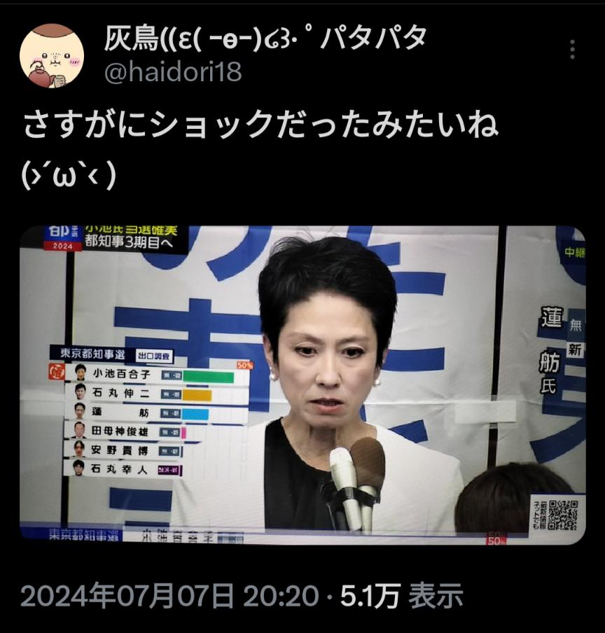【放送事故】3位が確定した瞬間の蓮舫の顔wwww【pickup】 2024/7/8 速報 この記事はアルファルファモザイクで話題になったネタを羅列して紹介している記事です。 【放送事故】3位が確定した瞬間の蓮舫の顔wwww 2: 蓮舫氏、まさかの惨敗に涙も…選対幹部「何が原因かよくわからない」 https://digital.asahi.com/sp/articles/ASS774DP7S77UTFK00NM.html 続きを読む ——— Source: アルファルファモザイク 【放送事故】3位が確定した瞬間の蓮舫の顔wwww【pickup】