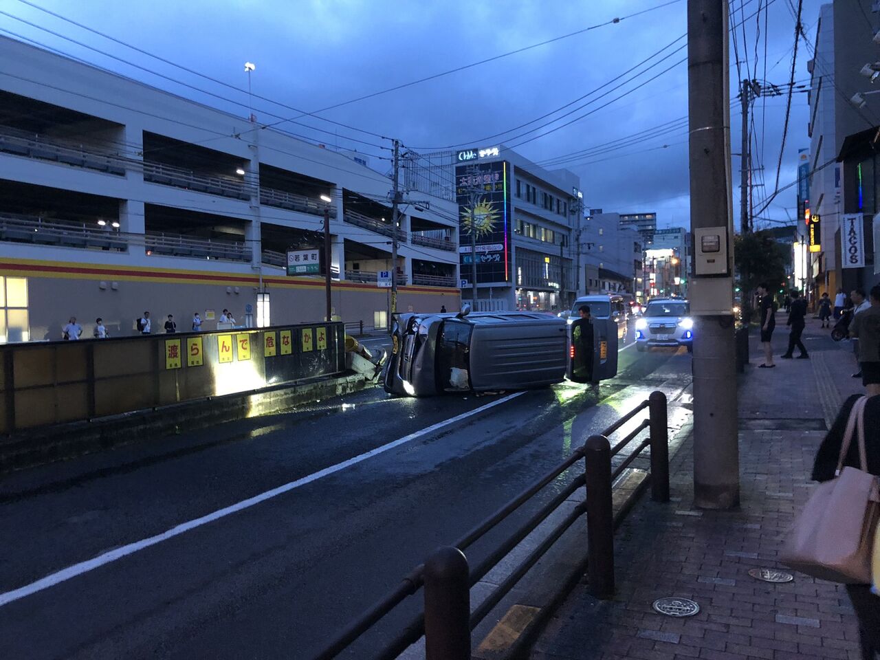 『若葉町の電停の停留所に軽突っ込んで横転』