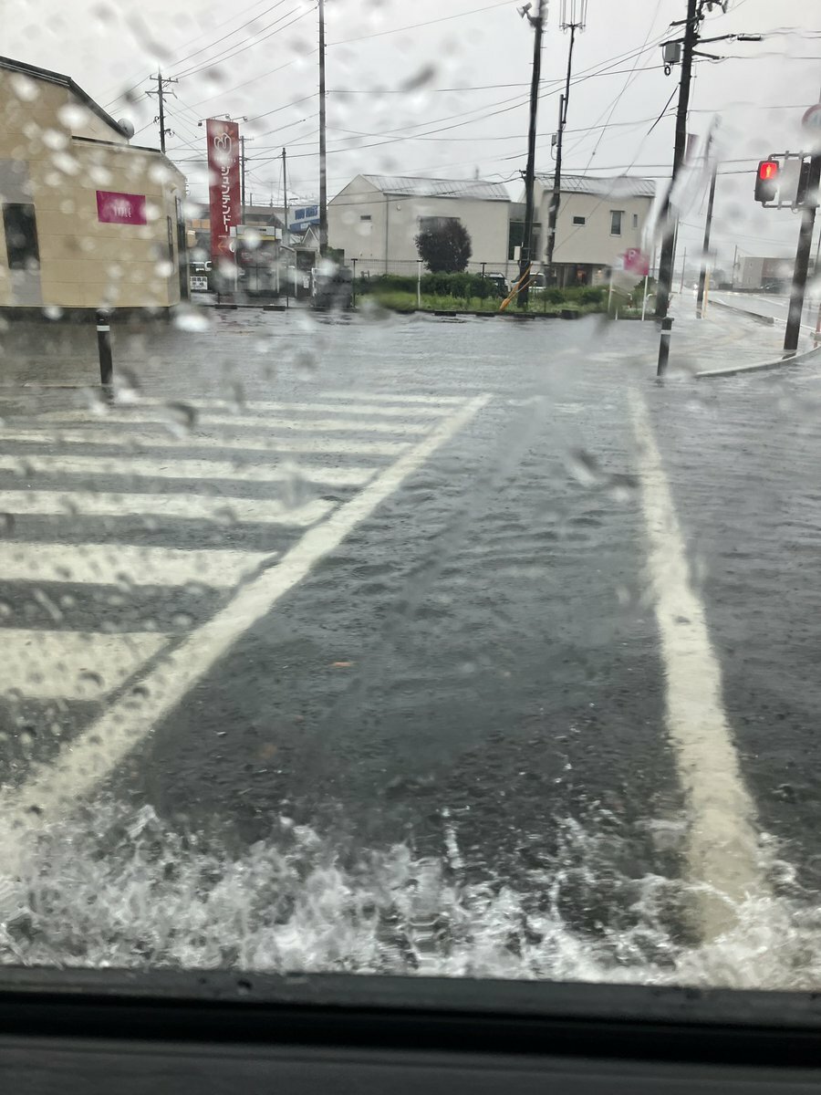 松江市黒田町では道路が冠水し、速度を落として走行する車や、ズボンの裾を膝までまくった歩行者の姿が見られた。#松江市 #出雲市 #大雨