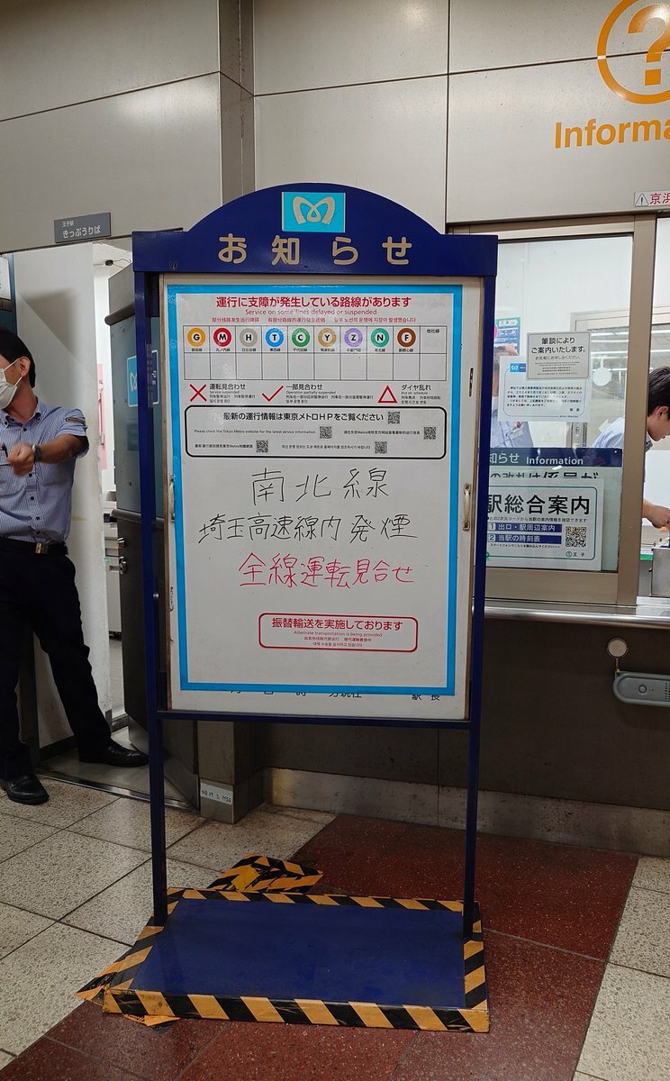 『まさかの南北線停電して、冷房切れて死ぬかと思った、、、やっと再開したと思ったら今度は架線から煙が出てるとかでまた停止。。。復旧までにかなりの時間がかかるみたい』