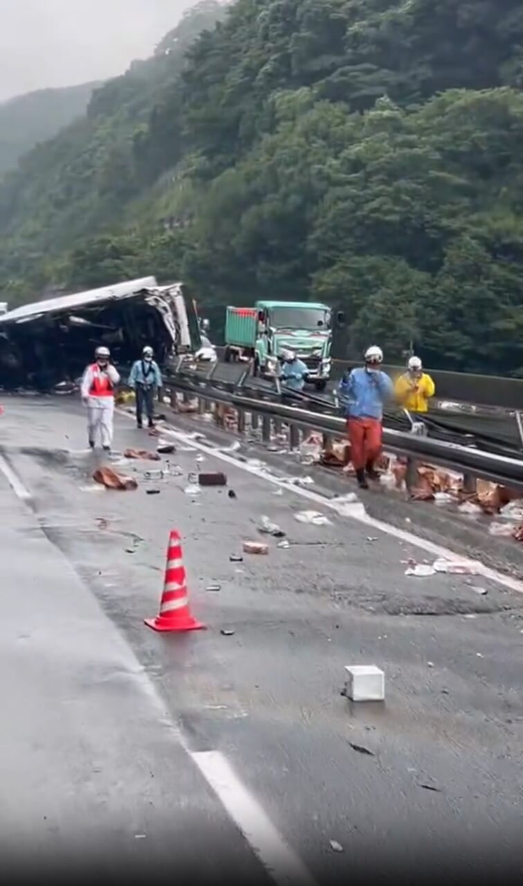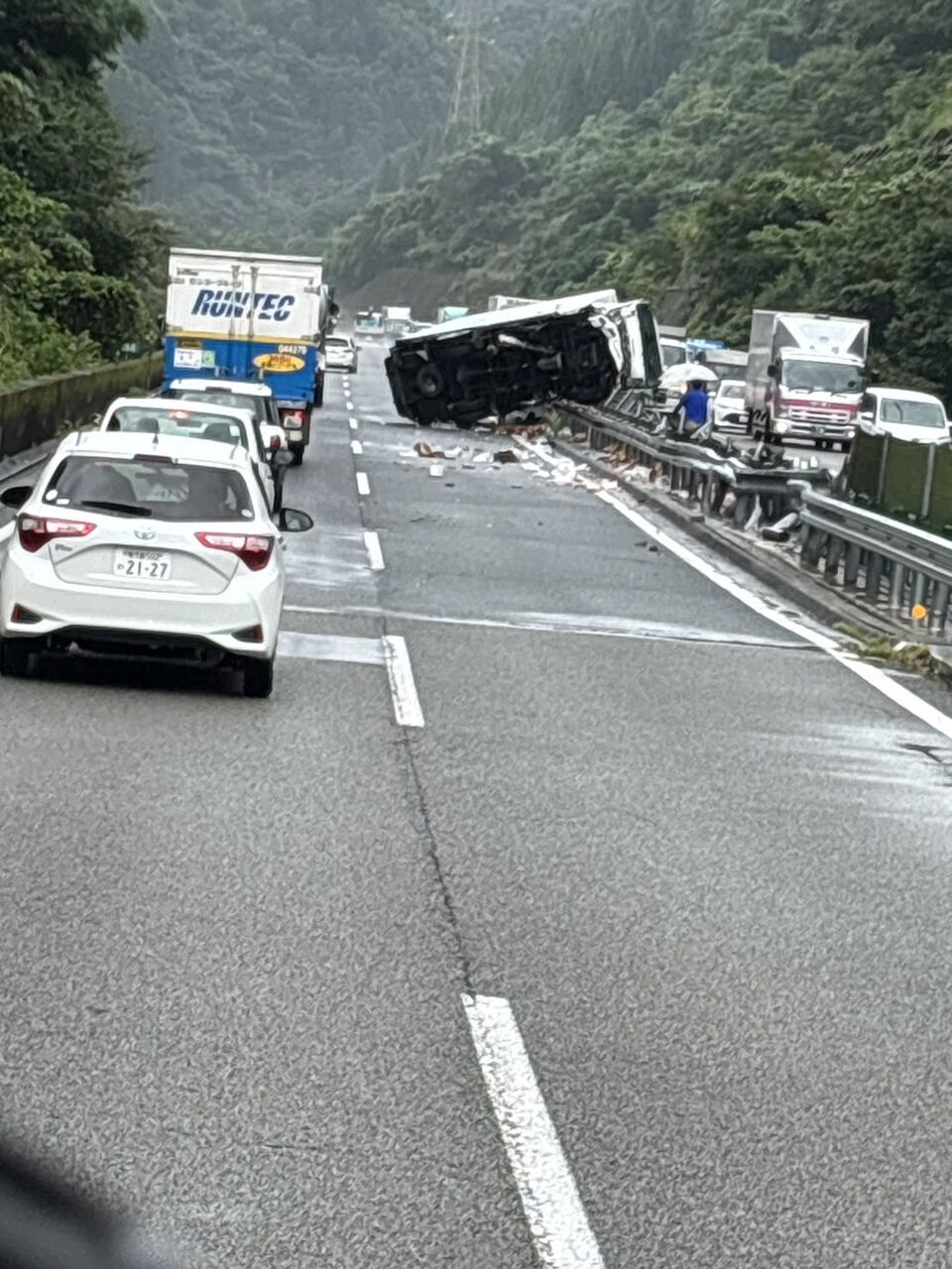 【現場の様子】#交通情報 #九州道 下り 淡島トンネル→山江SA付近 破片散乱中央分離帯にトラック横転事故で規制渋滞7月11日 #渋滞 #九州 #熊本 #鹿児島