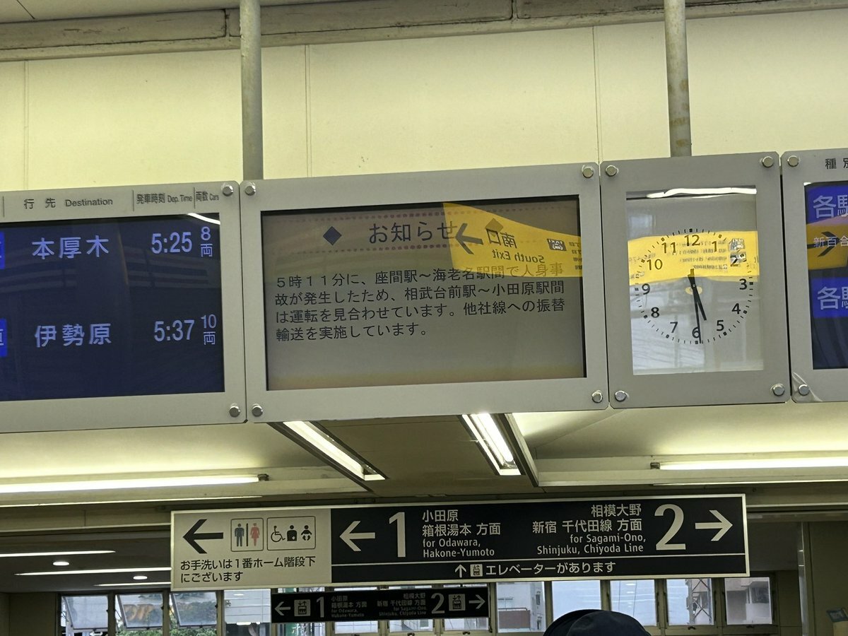 【小田急小田原線】05:11頃、座間〜海老名駅間で発生した人身事故の影響で、相武台前〜小田原駅間の運転を見合わせててぴえん🥺 振替輸送を行ってる pic.twitter.com/KlYeQMUeyW