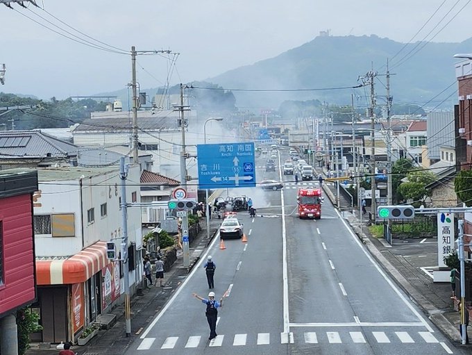 【現場の様子】#交通情報 #国道55号 高知県香南市赤岡町横町 高知銀行赤岡支店付近 車両から煙あがる衝突車両火災事故で規制渋滞7月14日 #高知 #香南 #火災 #三連休