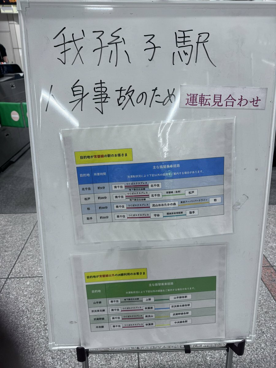 常磐線快速電車は、我孫子駅での人身事故の影響で、品川〜取手駅間の上下線で運転を見合わせています。運転再開見込は11時00分頃に変更になりました。 #常磐線快速電車 #Joban_Line https://t.co/t6M1XmagLg— JR東日本【常磐方面】運行情報 (公式) (@JRE_F_Joban) July 15, 2024