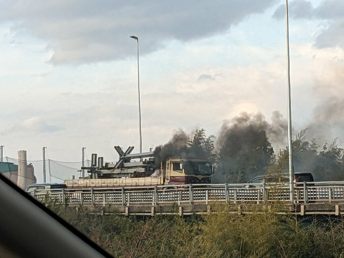 豊公橋でトラックの荷台から出火してる。これは橋封鎖になると思われる。ヤバ』
